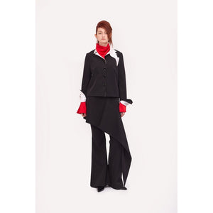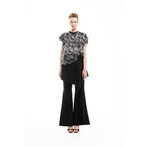 The overlay, which enhances the design’s uniqueness, features a hidden zipper and buttons, adding both practicality and sophistication. Perfect for special occasions or chic everyday styling, these trousers pair beautifully with fitted tops or matching blazers. Experience comfort and style with this unique blend of tailored craftsmanship and innovative design.h these black trousers featuring a striking asymmetric overlay that mimics a skirt-like design. Crafted from a soft, stretchy, medium-density blended fabric, they provide a smooth finish and maintain their shape. The trousers are designed with a high waist, flared legs, and a secure closure that includes a concealed zipper and hooks.