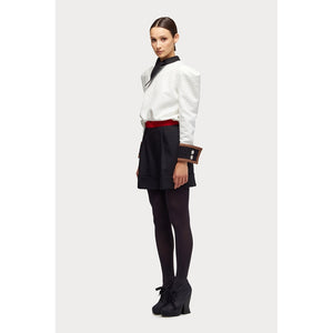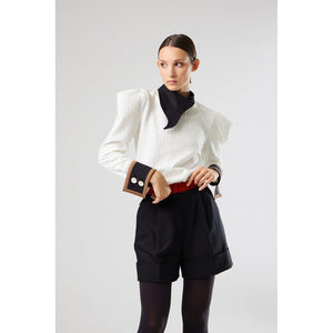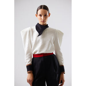 SELL WITH USStep into modern sophistication with the Fashion Asymmetrical Collar Blouse in White. Crafted from premium textured knit fabric, this blouse features a unique geometric pattern that adds depth to its design. The asymmetrical neckline, draped elegantly to one side, is accented with a bold black panel for striking contrast. Structured sleeves and tailored cuffs, with a subtle brown accent, provide a refined finish. Perfect for pairing with high-waist trousers or a sleek skirt, this blouse is ideal for making a statement in your everyday wardrobe.