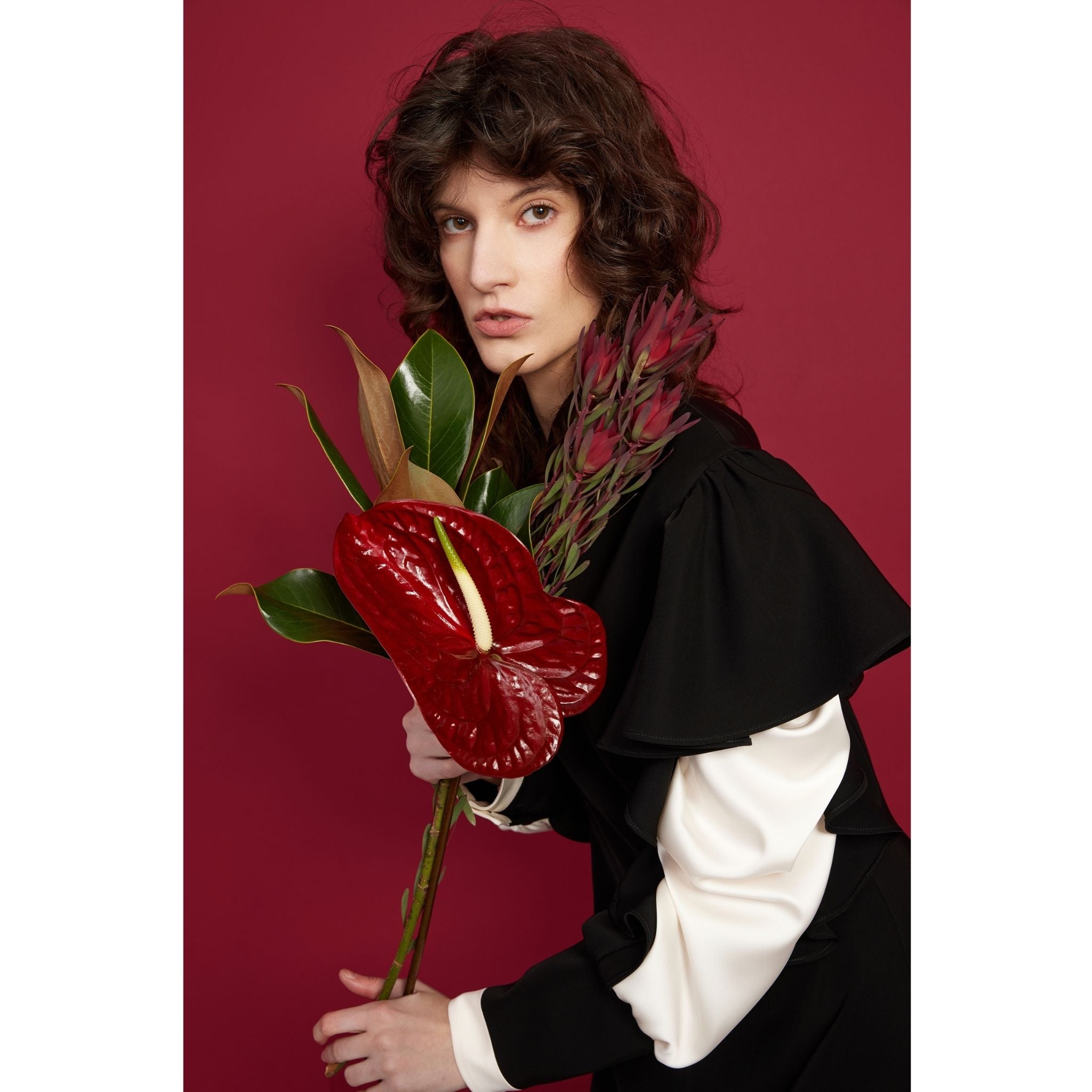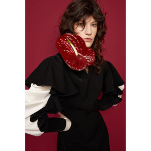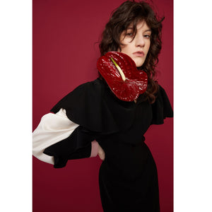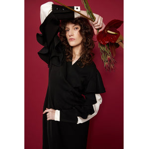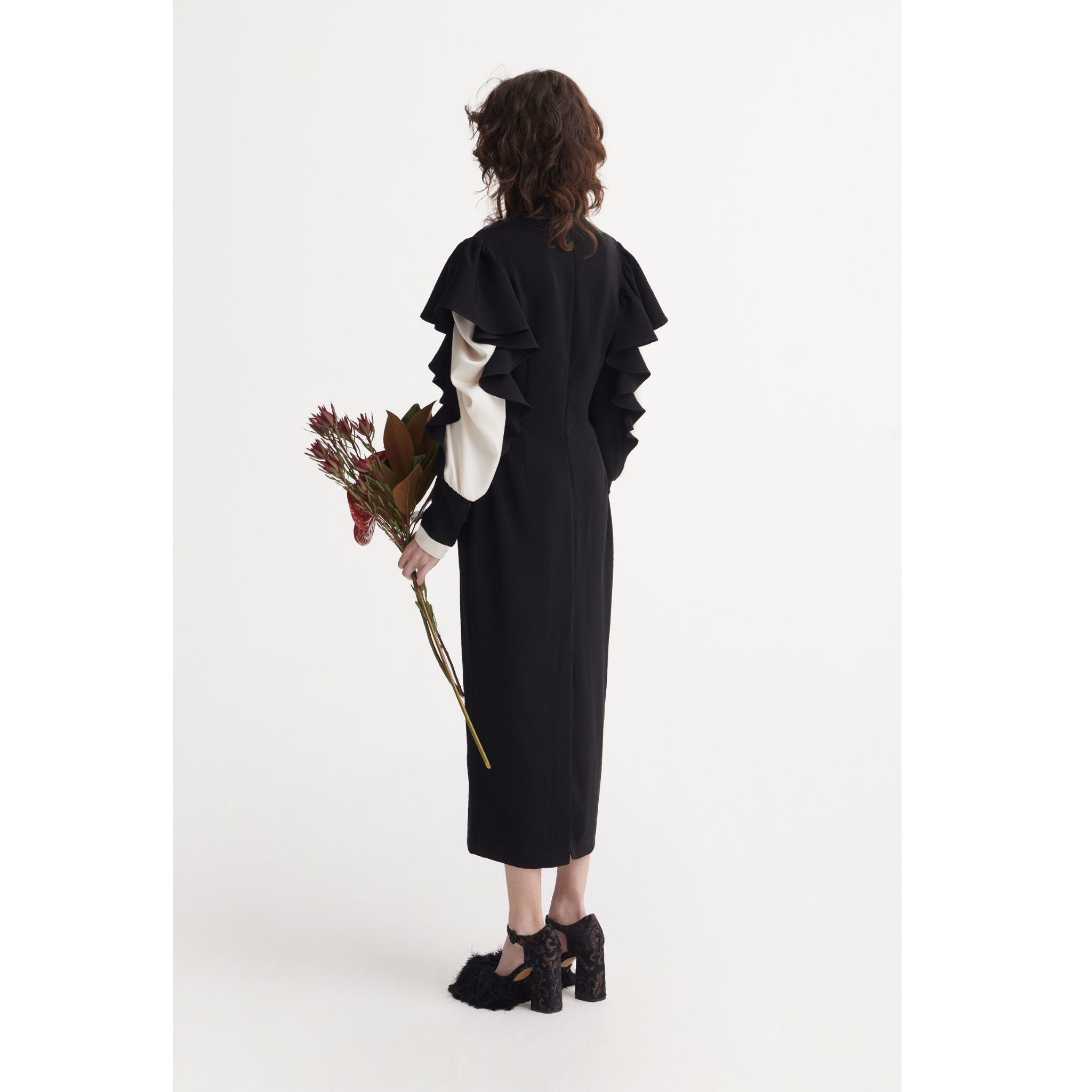 This Black Occasion Midi Dress is crafted from innovative nano crepe — a smooth, matte fabric that holds its shape beautifully and resists creasing. Designed for modern events, it features statement ruffled sleeves in contrasting satin, adding movement and a refined sculptural effect. The clean V-notch neckline subtly elongates the silhouette, while the hidden back zipper ensures a comfortable, precise fit. A structured waist flows into a straight midi-length skirt, creating an elegant, elongated line. Perfect as a special occasion dress, it delivers a confident designer look for evening events, celebrations, or elevated day-to-night styling.