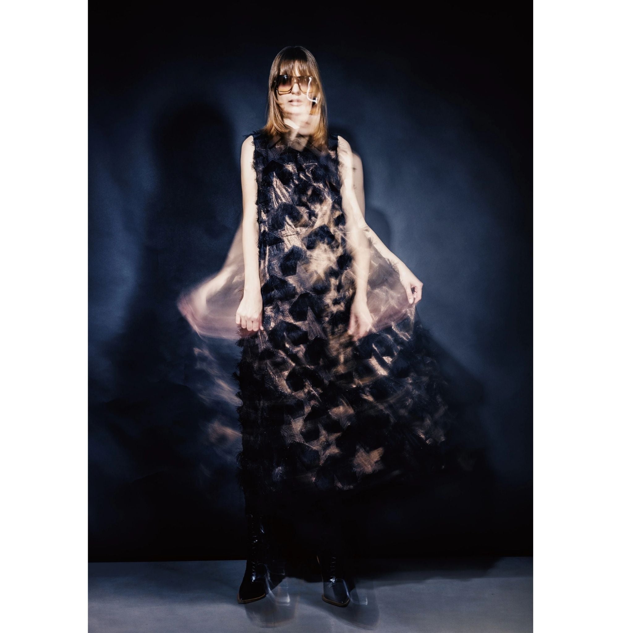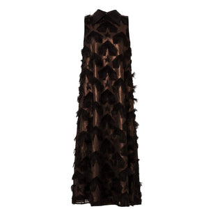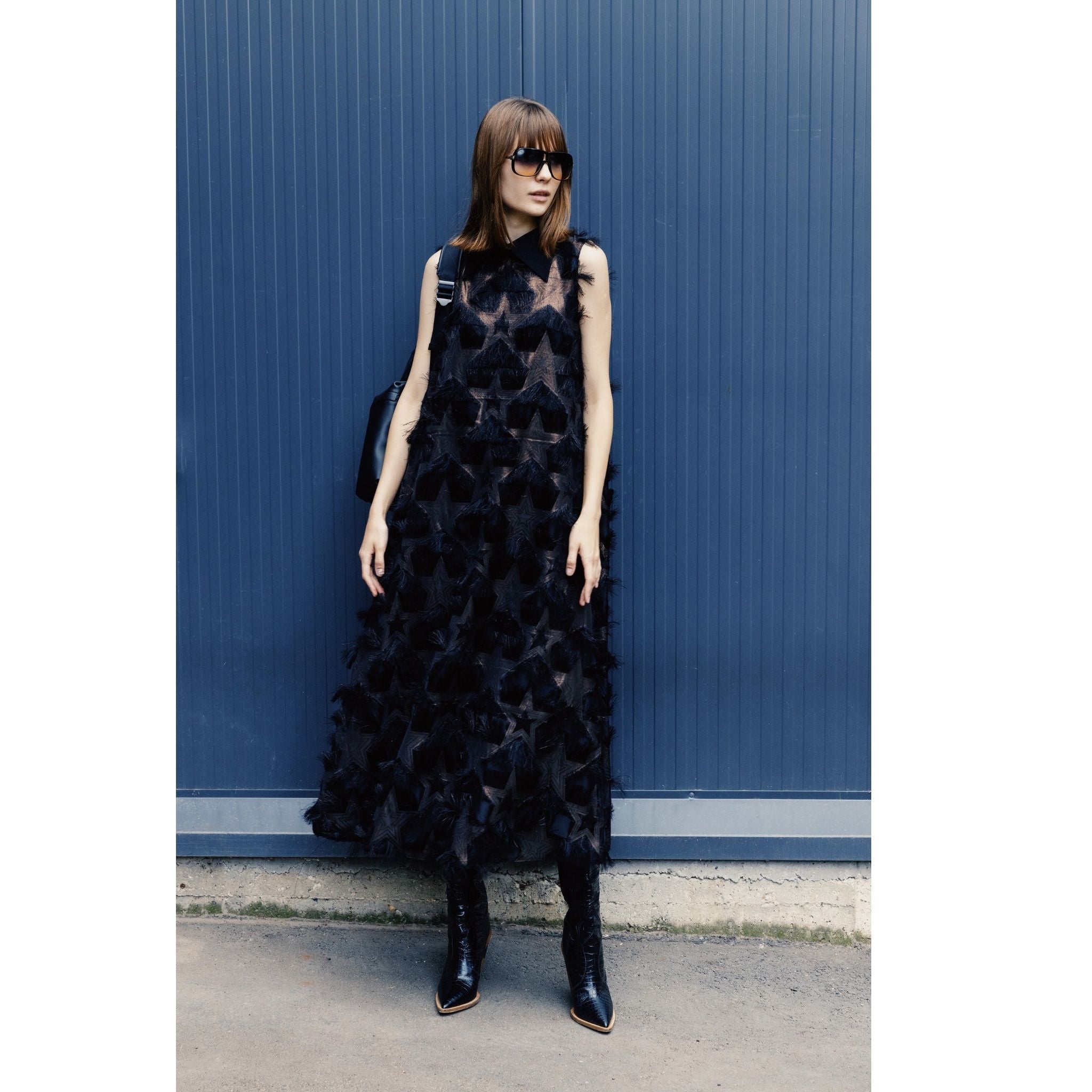 This floor-length dress in a simple A-line silhouette is guaranteed to make a splash at any event. The sleeveless dress covers all parts of the body, but creates a mysterious sexy image. The dress is decorated with a small stand-up collar made of soft fabric. The dress consists of two fabrics: the lining is viscose, and the outer fabric is partially fleecy, embroidered with decorative individual patterns-stars.