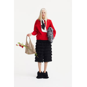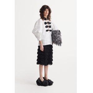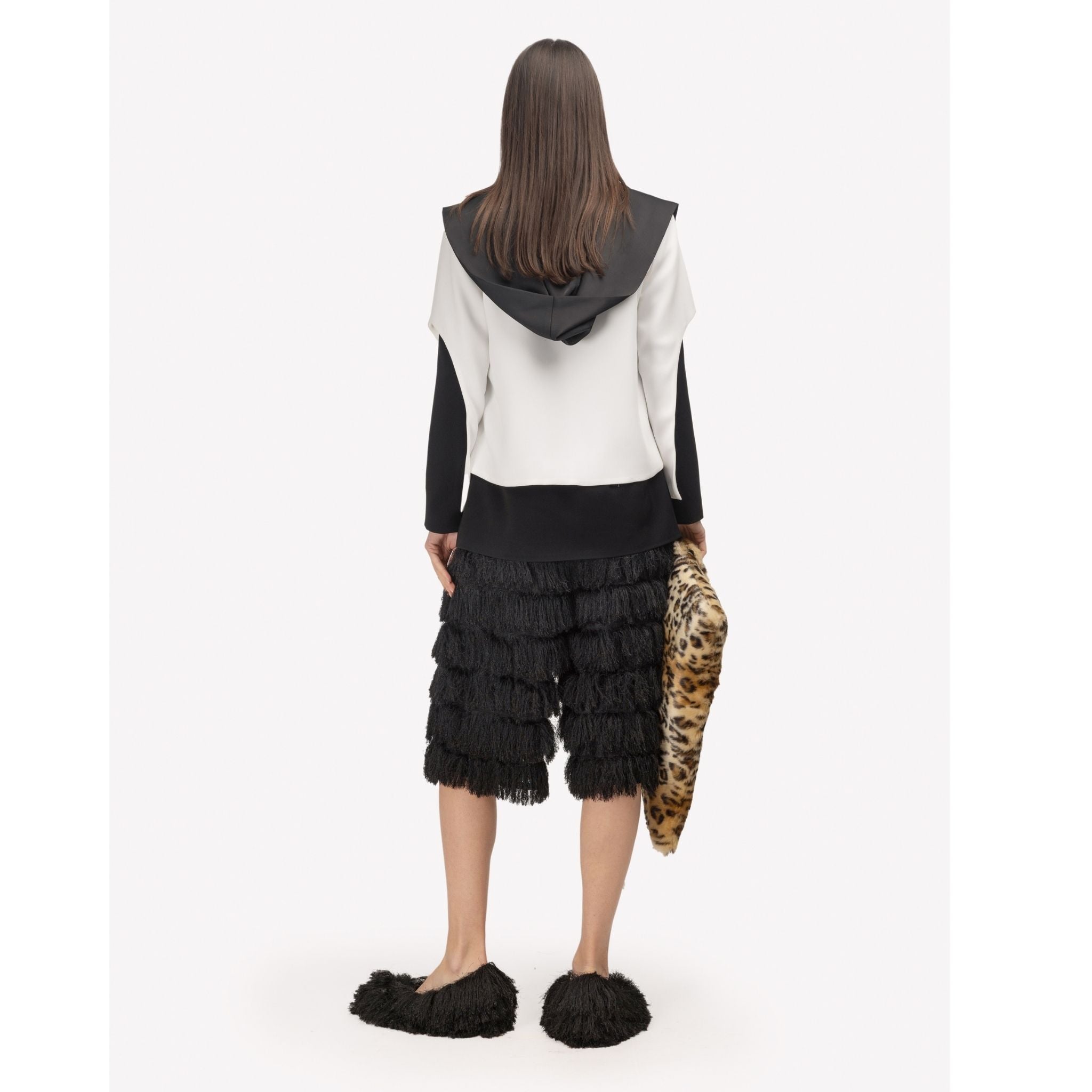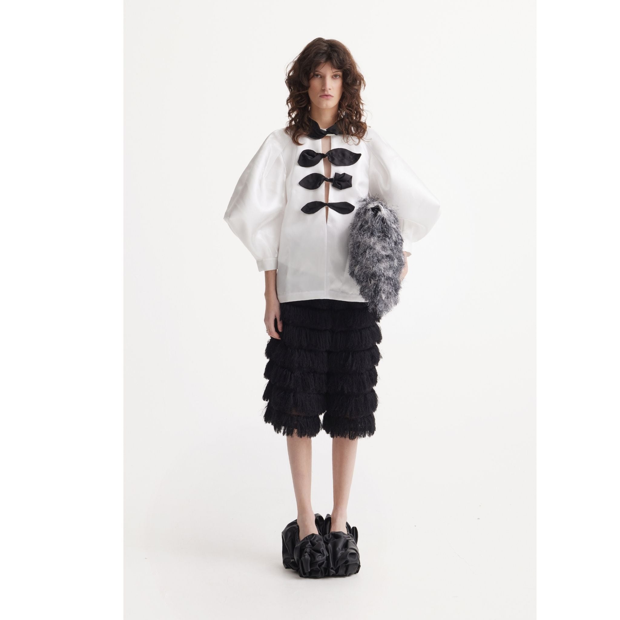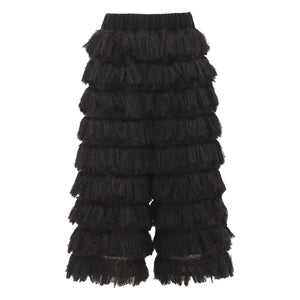 A statement piece that merges artistry with construction. These black Bermuda shorts are crafted from a structured base fabric, layered with rows of textured fringe that create sculptural volume and fluid motion with every step. The elastic waistband ensures a comfortable fit, while the fully lined interior maintains the shape and enhances wearability. Falling just below the knee, the silhouette offers a contemporary balance between boldness and refinement. Each fringe tier is meticulously applied, forming a rhythmic architectural texture that transforms movement into design. Pair them with minimal tops or oversized knits for a look that defines modern avant-garde elegance.