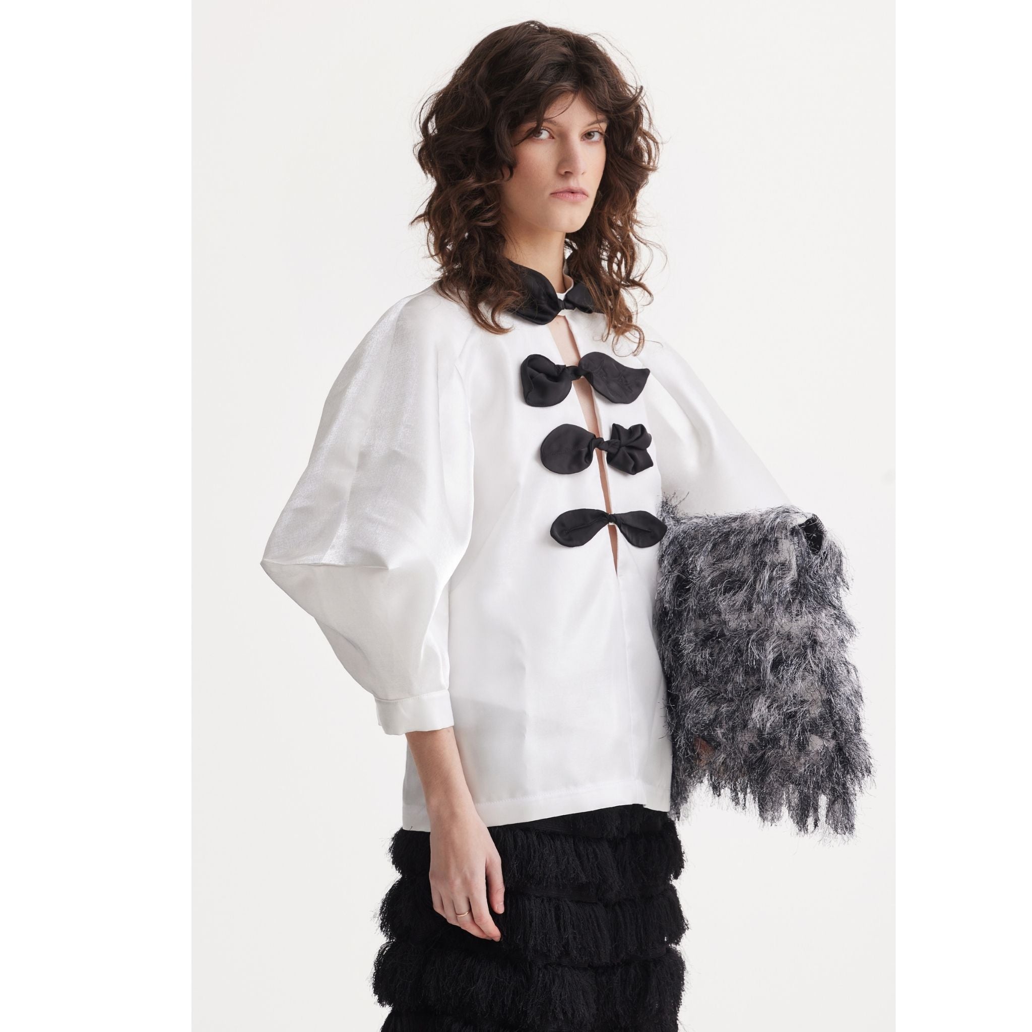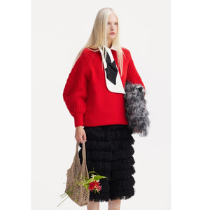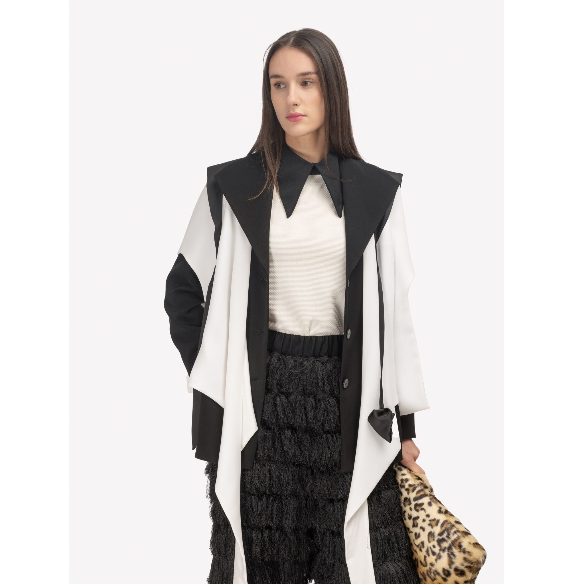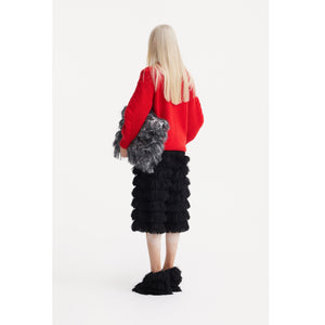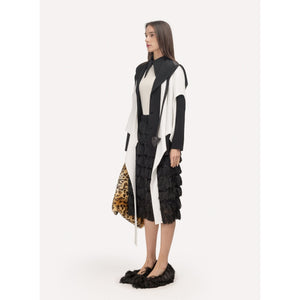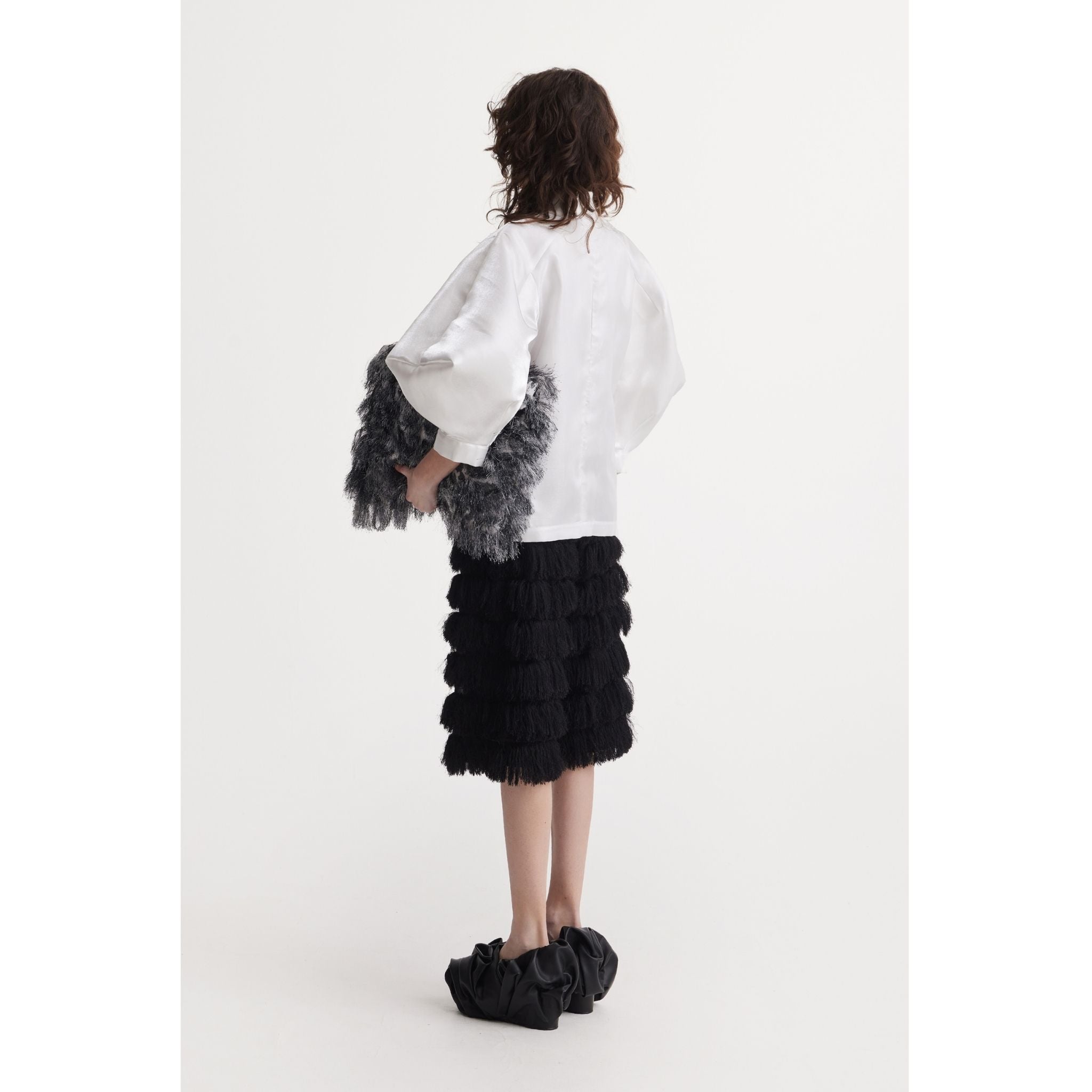 A statement piece that merges artistry with construction. These black Bermuda shorts are crafted from a structured base fabric, layered with rows of textured fringe that create sculptural volume and fluid motion with every step. The elastic waistband ensures a comfortable fit, while the fully lined interior maintains the shape and enhances wearability. Falling just below the knee, the silhouette offers a contemporary balance between boldness and refinement. Each fringe tier is meticulously applied, forming a rhythmic architectural texture that transforms movement into design. Pair them with minimal tops or oversized knits for a look that defines modern avant-garde elegance.