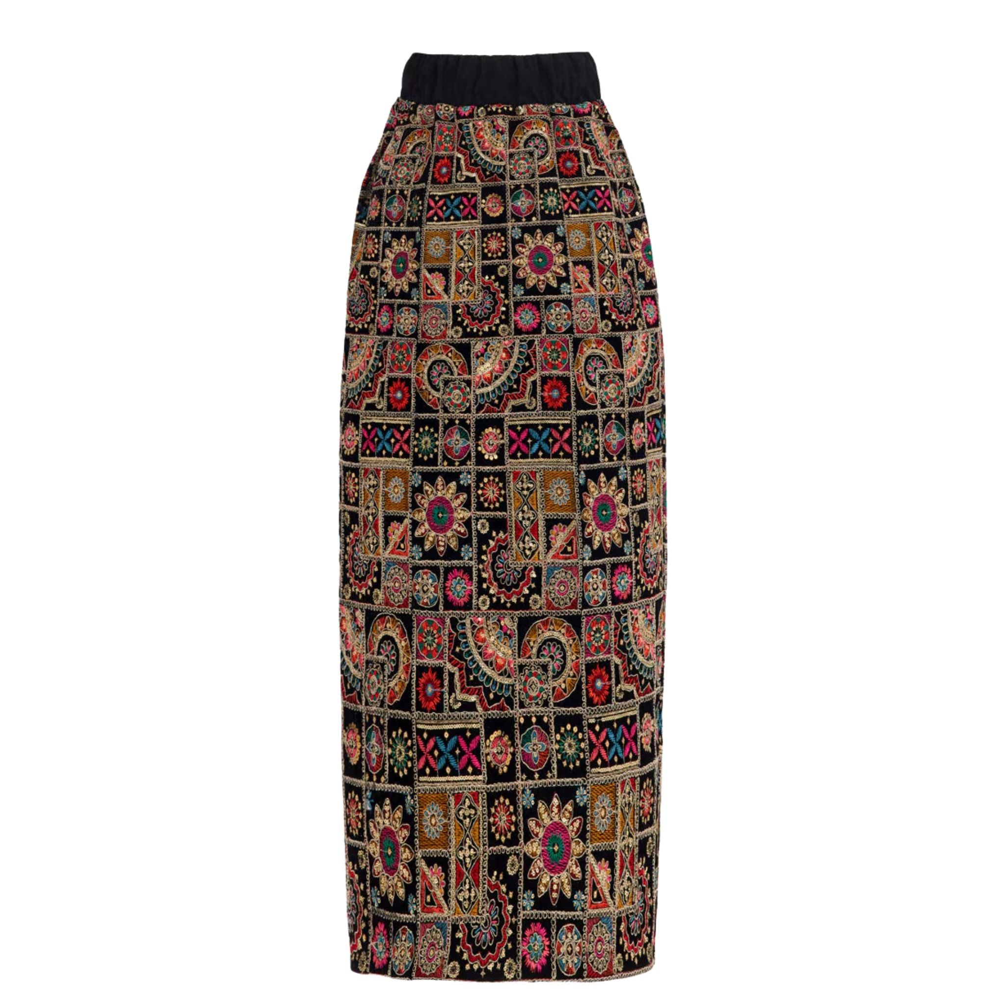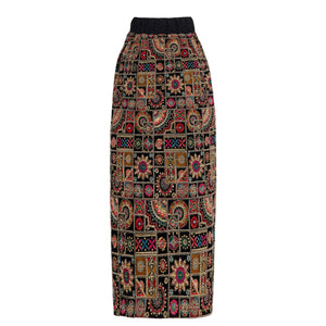 Elevate your wardrobe with this intricately embroidered mid-calf skirt, a masterpiece of vibrant floral and geometric patterns accented with shimmering threads. Designed with a high-waisted elastic waistband, it offers a flattering fit and effortless comfort.