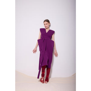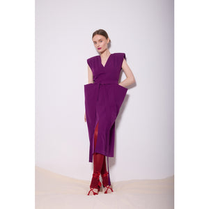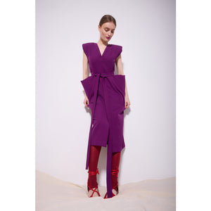 Make a bold statement in this violet midi dress featuring strong padded shoulders, a deep V-neckline, and a waist-defining matching belt. Crafted from structured suiting fabric, it flatters with sharp hip panels and a front slit for effortless movement. Ideal for spring events, power dressing, or cocktail parties, this fashion-forward piece radiates confidence and elegance.