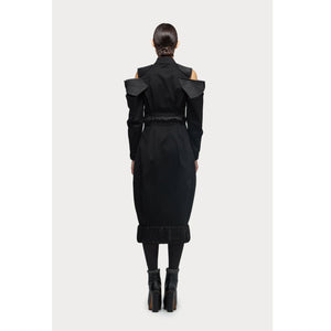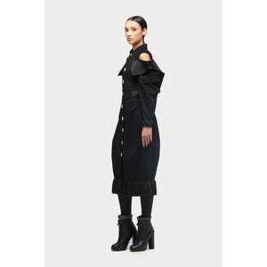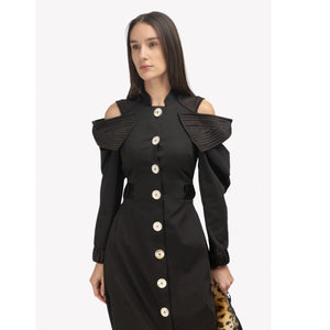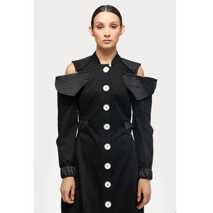 Command attention with the Evening Shoulder-Cut Military Dress in Black, a bold and sophisticated piece tailored from luxurious suiting cotton with satin details. This dress features a structured silhouette with sharp shoulders and a high neckline, enhanced by a row of oversized contrast buttons down the front. Intricate pleating at the shoulders and hemline adds an elegant touch, while the daring open shoulder design highlighted with satin accents makes it perfect for both daytime and evening occasions. Pair with boots or heels for a striking look.