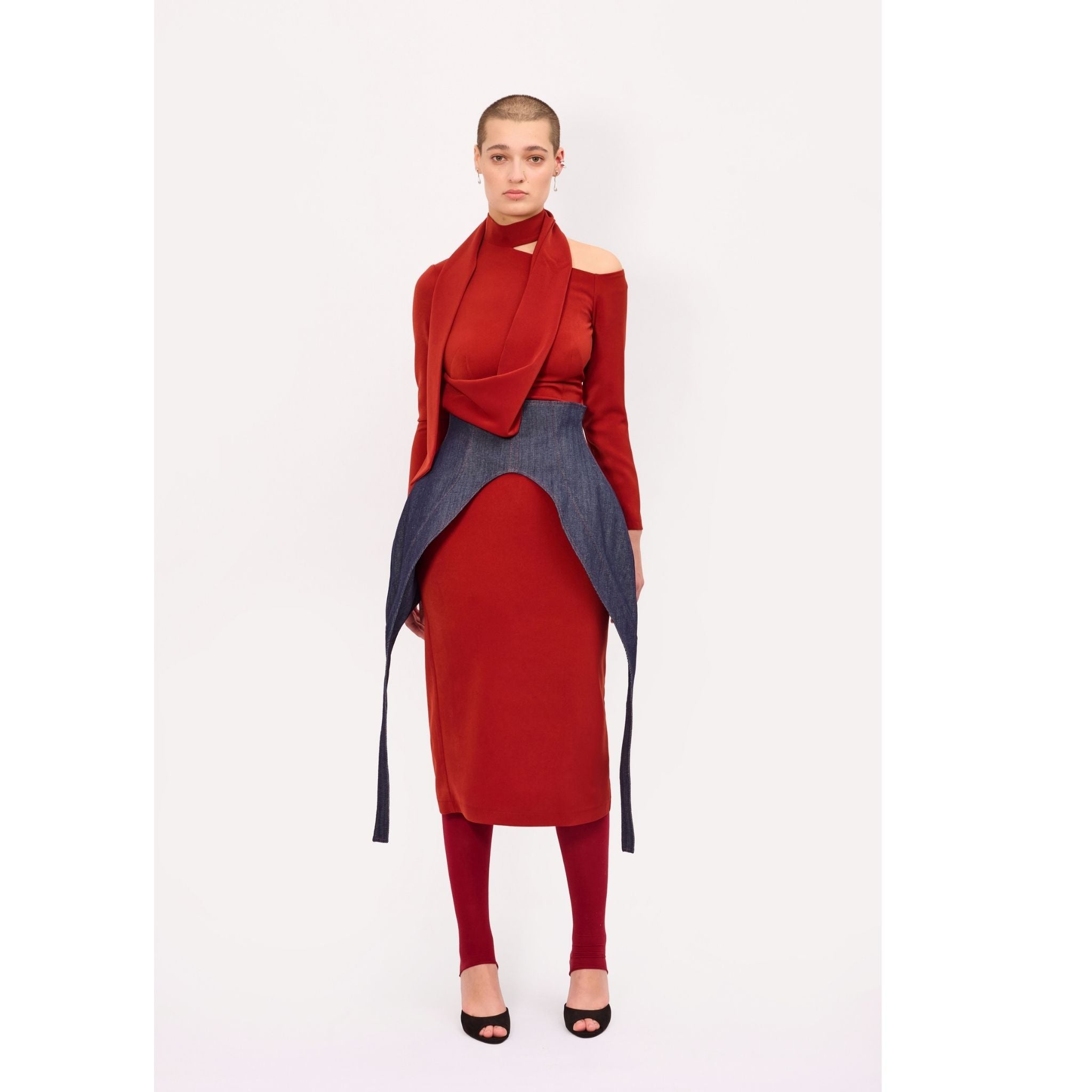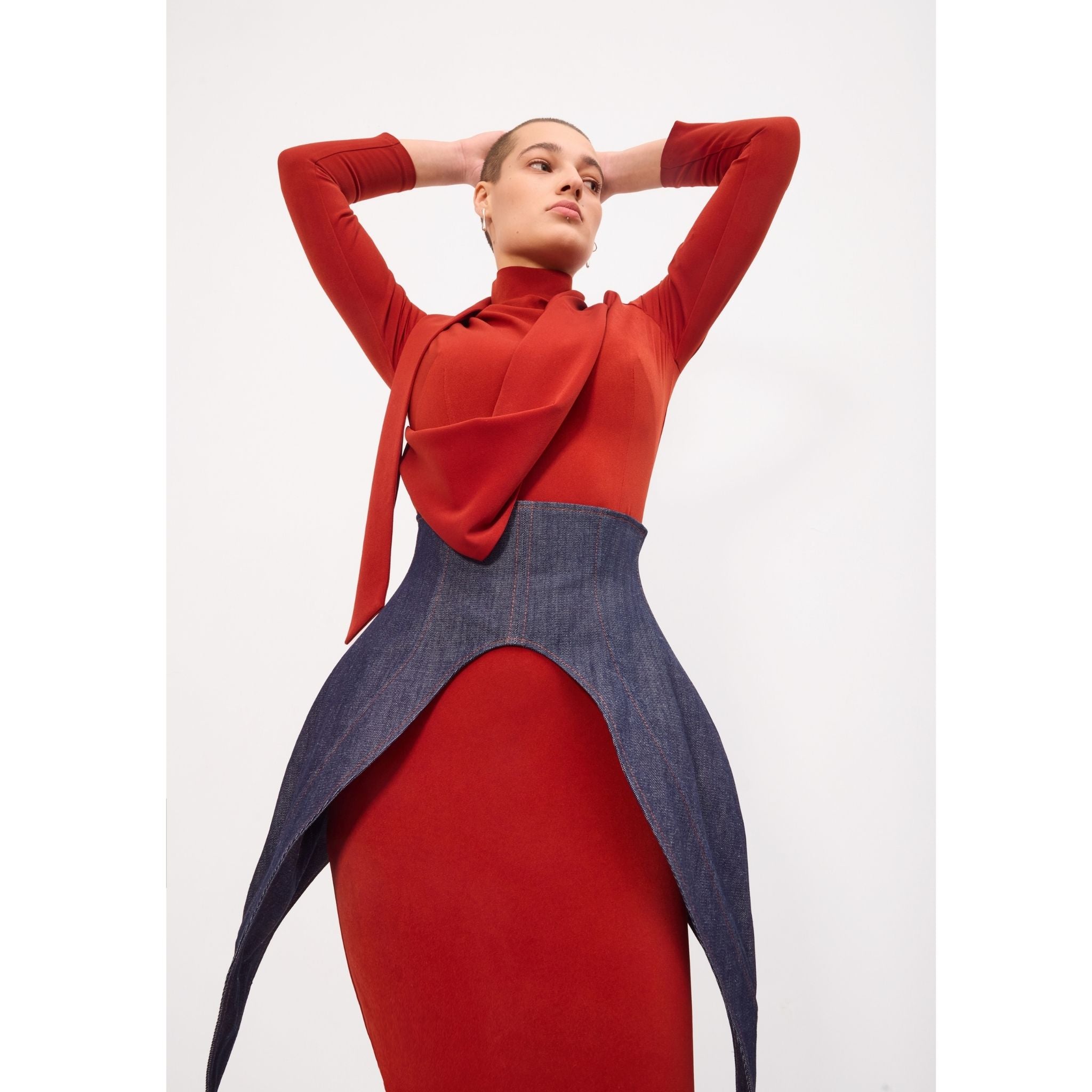 The Julia Allert Minimalist Waist Corset For Layering Blue Denim merges denim structure with sculptural refinement. Made from premium blue denim with contrast stitching, the Minimalist Waist Corset For Layering Blue Denim shapes the waist organically while adding a bold architectural layer. Lightweight padding ensures its form stays crisp. Ideal for styling over dresses, shirts or knitwear.