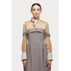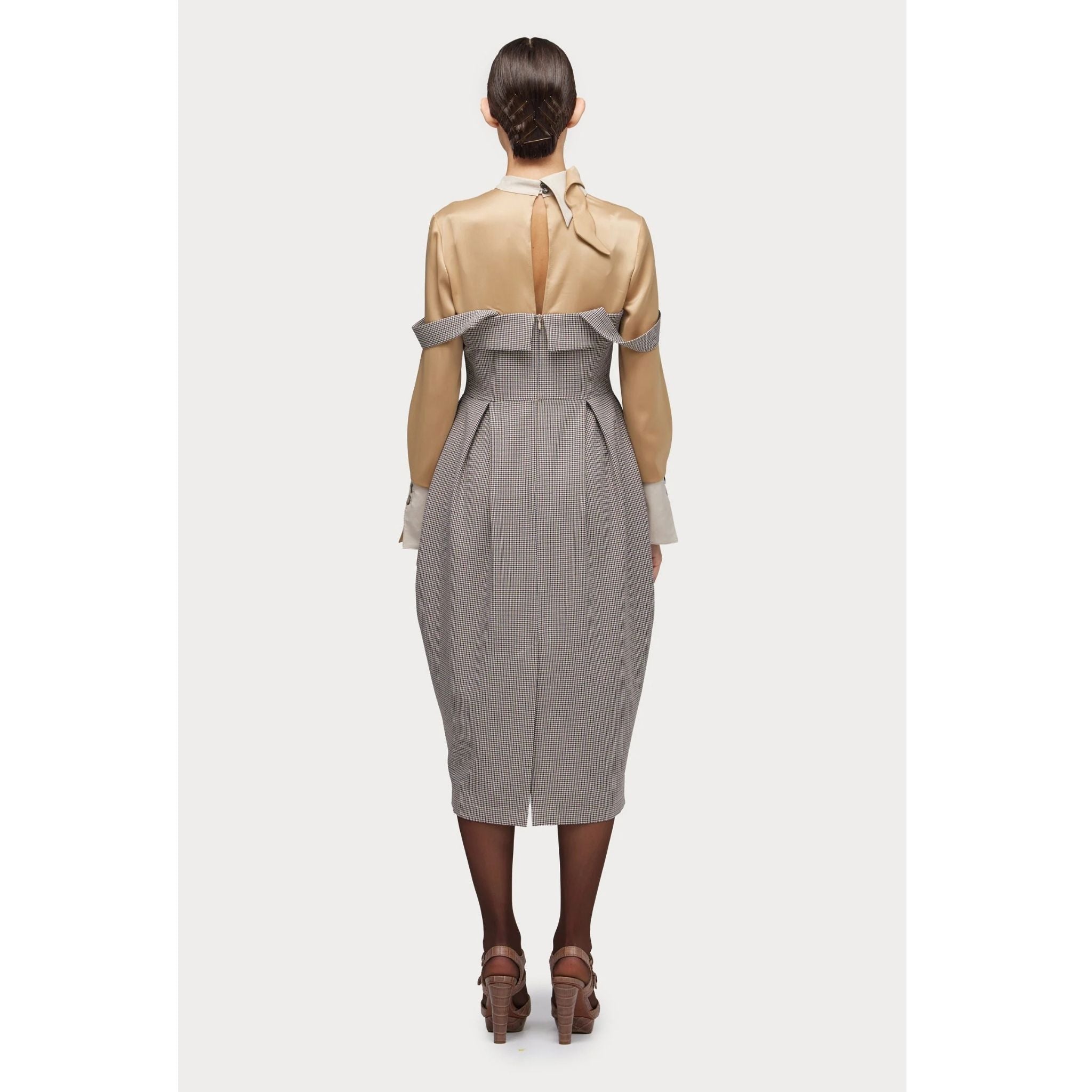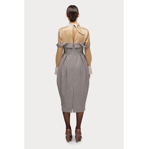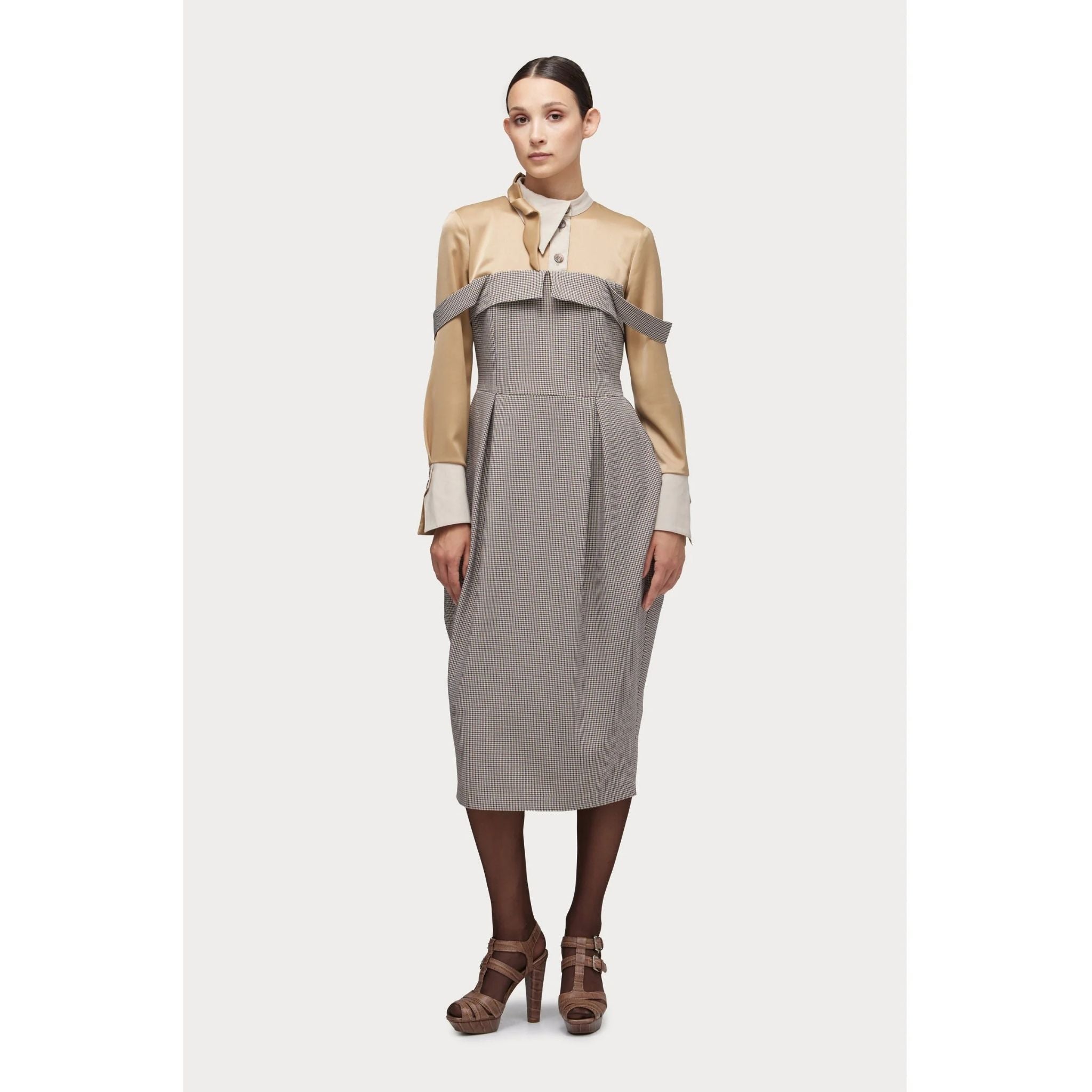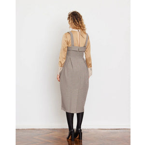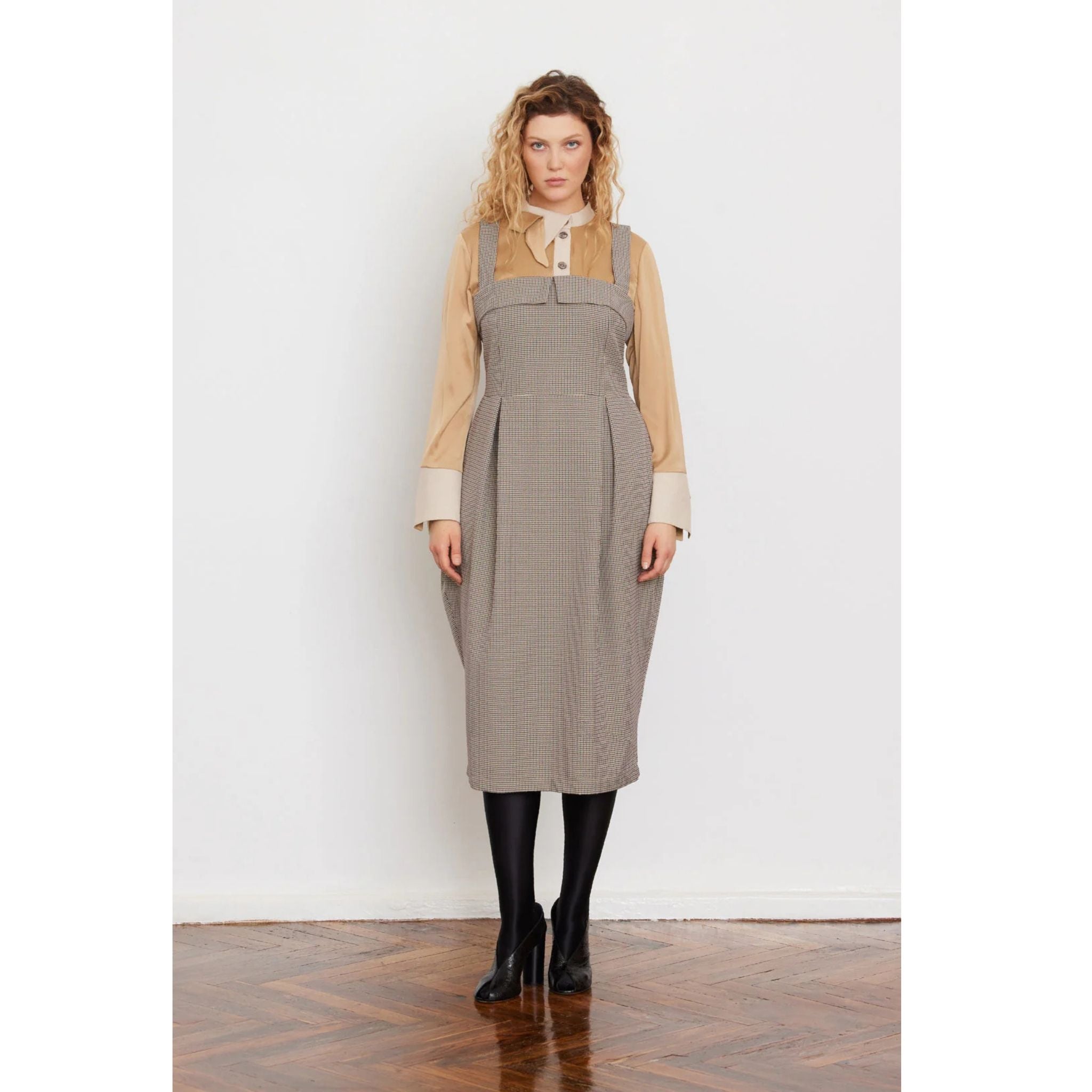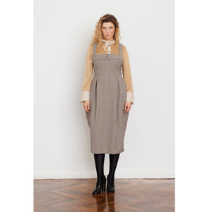 This sophisticated pinafore dress in a timeless houndstooth pattern is designed to elevate your style. Featuring a fitted silhouette, it accentuates the waist while offering a tailored yet comfortable fit. The structured bodice, with wide straps and a pleated front, adds a refined touch. Paired with a contrasting blouse insert, crafted from soft fabric with elegant cuffs and a bow-tie collar, this dress creates a polished, layered look.