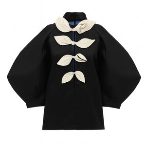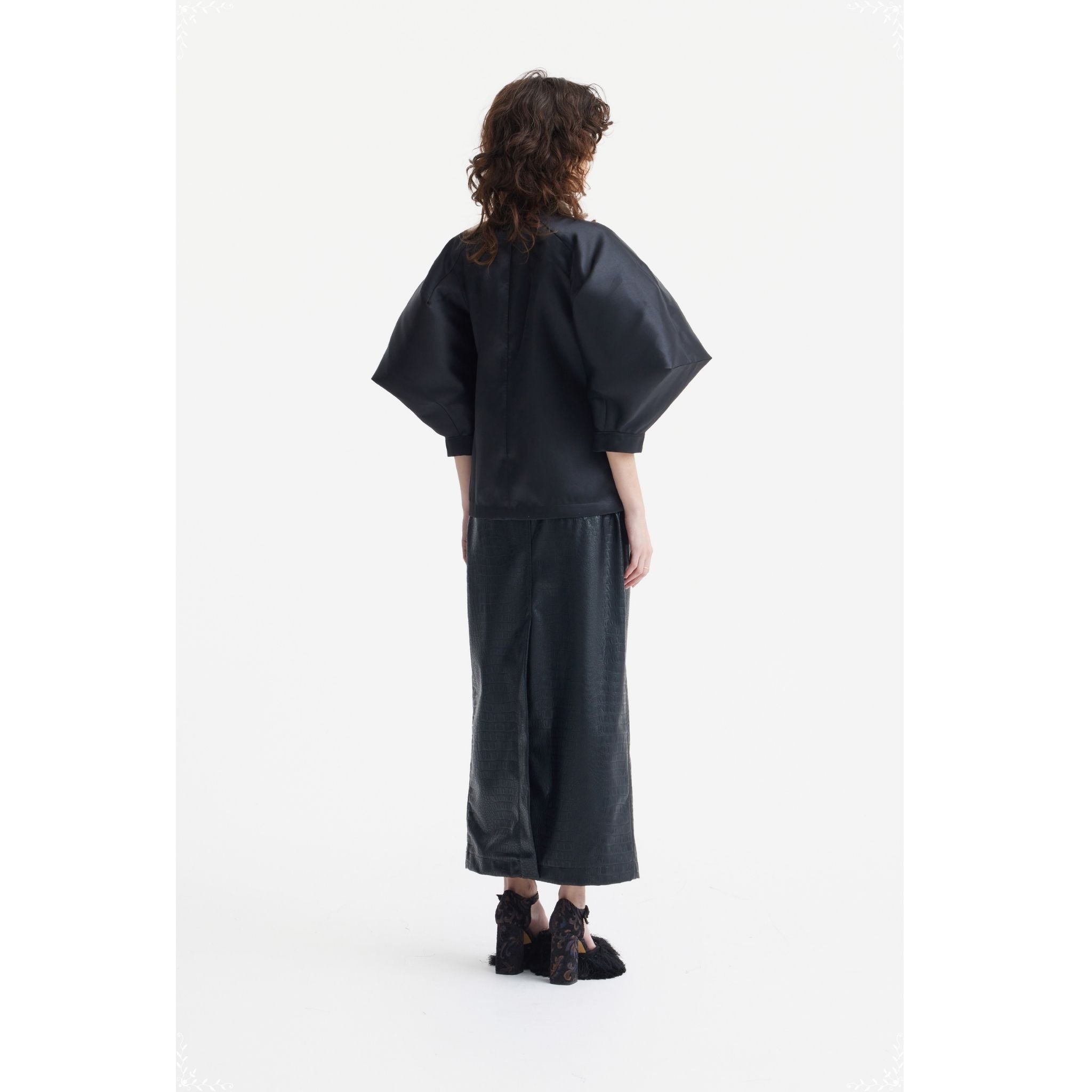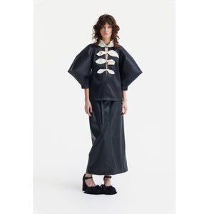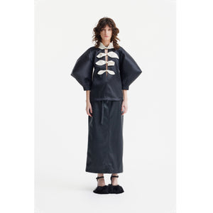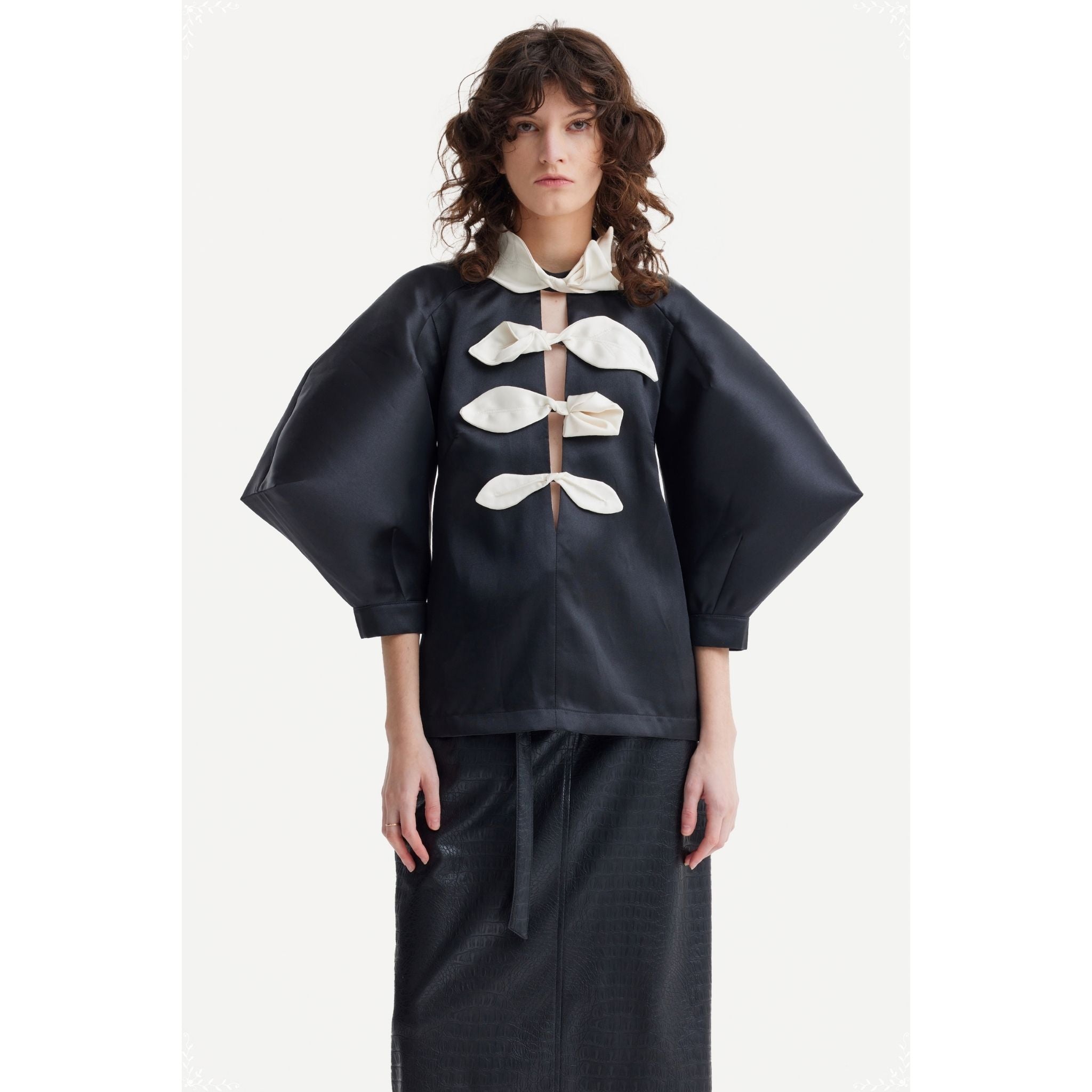 The Black Taffeta Deep V-Neck Blouse with Satin Floral Detail by Julia Allert embodies refined sculptural femininity. Made from structured taffeta, the Black Taffeta Deep V-Neck Blouse features a deep V neckline, voluminous sleeves, and a concealed zip for a sharp, clean silhouette. Satin floral embellishments introduce softness against the glossy surface, capturing an interplay of strength and delicacy. This Julia Allert statement piece is crafted for women who value sophistication, individuality, and timeless design.