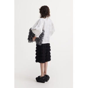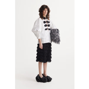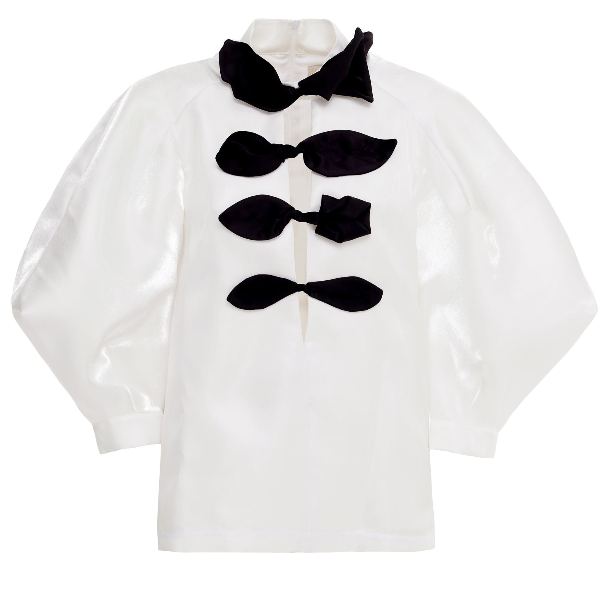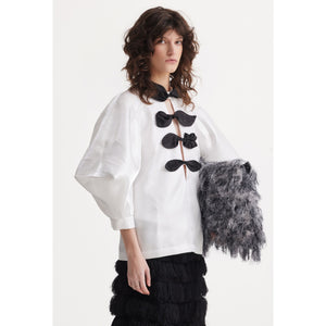 The Taffeta Deep V-Neck Blouse with Satin Floral Detail – White by Julia Allert embodies refined femininity through sculptural form and textural contrast. Crafted from structured taffeta with a smooth lining, it features a deep V neckline, voluminous sleeves, and a concealed zip closure that ensures a clean silhouette. Satin floral embellishments add a soft, artistic touch to the glossy fabric, creating an interplay of strength and delicacy. The muted taupe tone enhances its architectural beauty, making this blouse a statement piece for modern women who value sophistication, individuality, and timeless design.