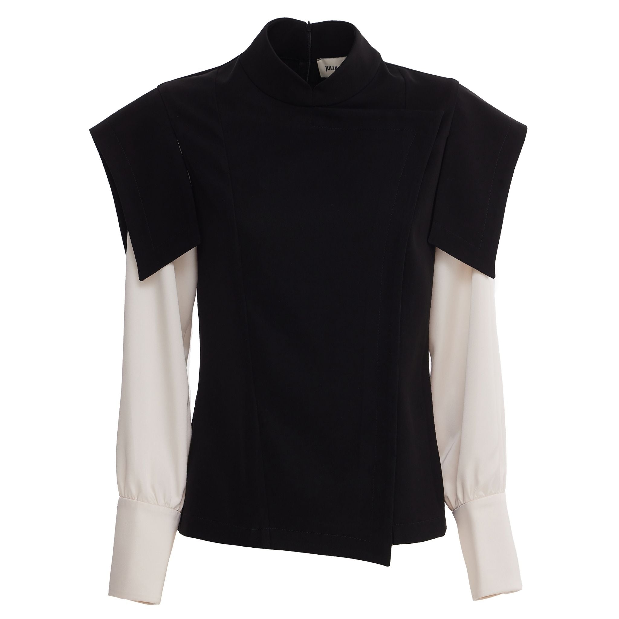 This Tailored Blazer-Style Blouse with Satin Sleeves is crafted from advanced nano crepe, a modern fabric made with ultra-fine threads that create a smooth matte surface, strong crease resistance, and clean shaping. The contrasting satin sleeves are finished with buttoned cuffs, adding a refined touch to the structured silhouette. A front wrap forms the blazer-inspired look, while the hidden back zipper ensures a secure fit. This design balances sharp lines with a contemporary attitude, pairing effortlessly with tailored trousers or minimalist skirts for confident day-to-night styling.