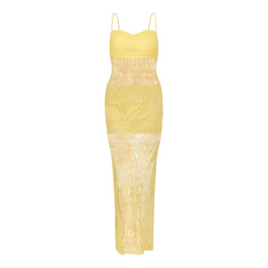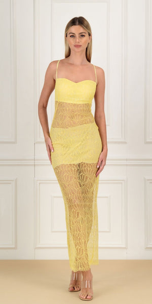 SELL WITH USA sheer macramé lace maxi dress with crisscross straps and open back. The Golden Hour dress offers a striking silhouette perfect for summer nights and tropical escapes.