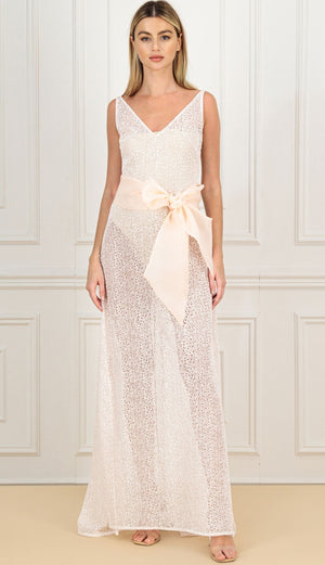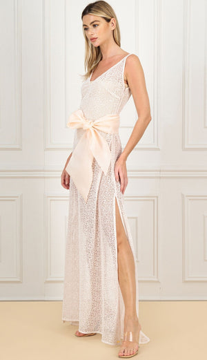 SELL WITH USThe brand's Sleeveless Open Neck Minimalist Gown, crafted from heavy-weight floral guipure with transparent sequins, features a semi-sheer A-line silhouette, a wide bow tie belt, side slits, and a mini tail. This gown exudes modern romance and elegance, ideal for minimalist weddings or captivating ball gowns, perfect for any special occasion.