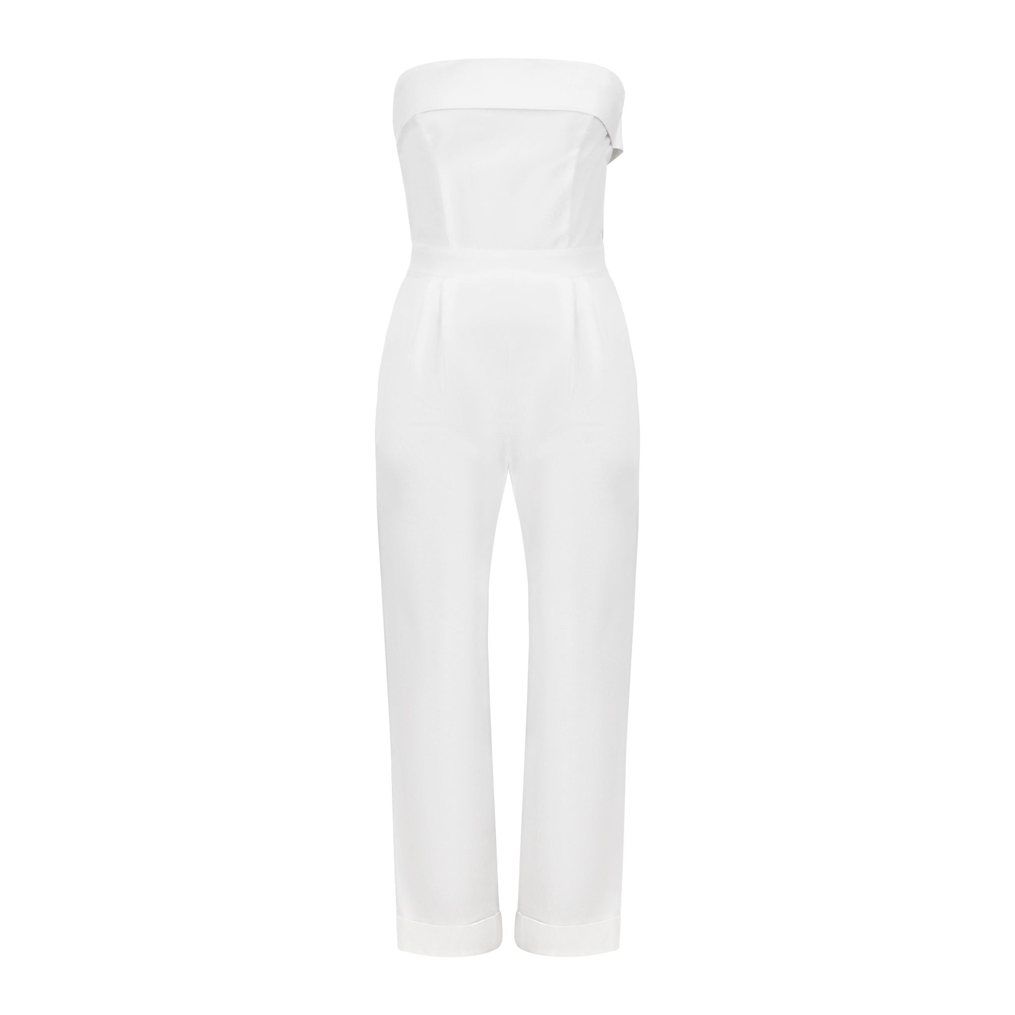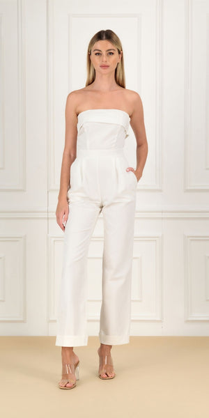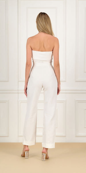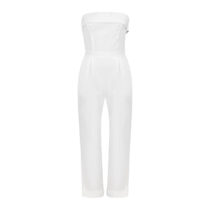 Tailored strapless jumpsuit in structured Italian canvas, featuring pockets and a sleek silhouette. Ideal for gallery events and elegant summer soirées.