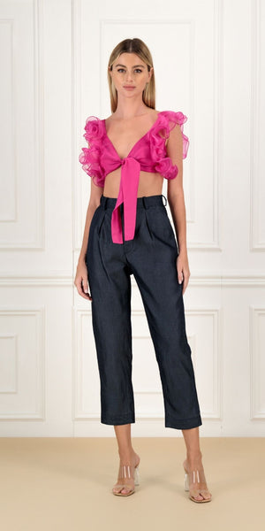 Crafted from airy silk organza, the Sunkiss Bralette features sculptural ruffles and a tie-back detail. Ideal for tropical escapes, beach brunches, or resort evenings.