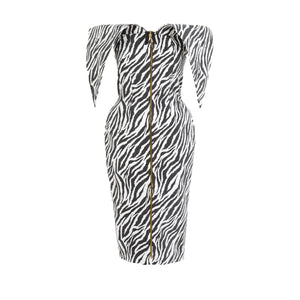 Make a statement in this bold Strapless Zebra Dress, designed with sculpted hips and the brand’s signature 'Envelope' detailing. The striking zebra print and structured silhouette flatter the figure, while a sleek front zipper adds an edgy finish. Perfect for cocktail parties or standout street style, this bodycon mini dress blends bold fashion with architectural elegance.
