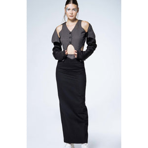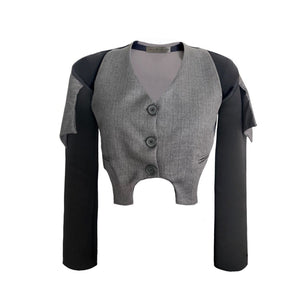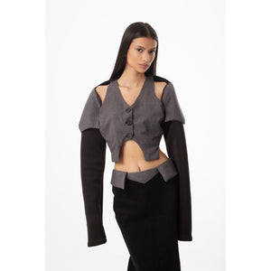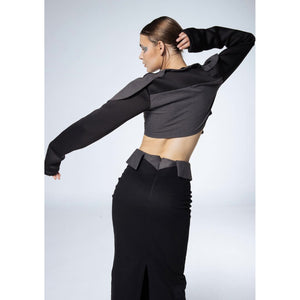 Tailored jacket in mixed polyester fabrics, featuring contrasting black sleeves and a grey body. Designed with structured lines and bold shoulder cut-outs, this piece redefines classic tailoring with an architectural edge. Made in Mexico, designed by Tania Orellana. A statement jacket that balances sophistication with avant-garde detail, ideal for both formal layering and fashion-forward styling.