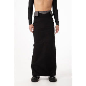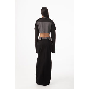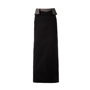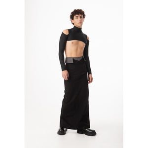 Long black skirt in stretch cotton, featuring a contrasting grey belt detail that accentuates the waist. Crafted with a fluid yet structured silhouette, this piece embodies elegance with a contemporary twist. Made in Mexico, designed by Tania Orellana. A versatile staple that transitions seamlessly from refined daywear to statement evening looks.