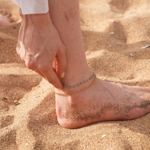 SELL WITH USPlayfully elegant and effortlessly cool, the Jemy Turquoise Chain Anklet by Linya Jewellery is your go-to statement for sun-drenched days. Handmade in Turkey from 925 sterling silver with 22k gold plating, it features a double-chain silhouette—one strand of fine turquoise beads and one of polished gold links—for a layered look in one piece. Delicate yet impactful, this anklet complements sandals, slides, and barefoot beach moments with a touch of bohemian sophistication. Limited in production and independently crafted, it’s a celebration of detail and intentional design, perfectly aligned with DOORS.NYC’s commitment to artisanal luxury.