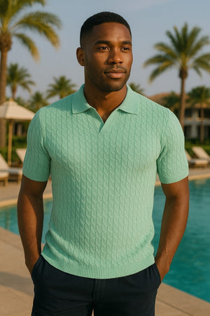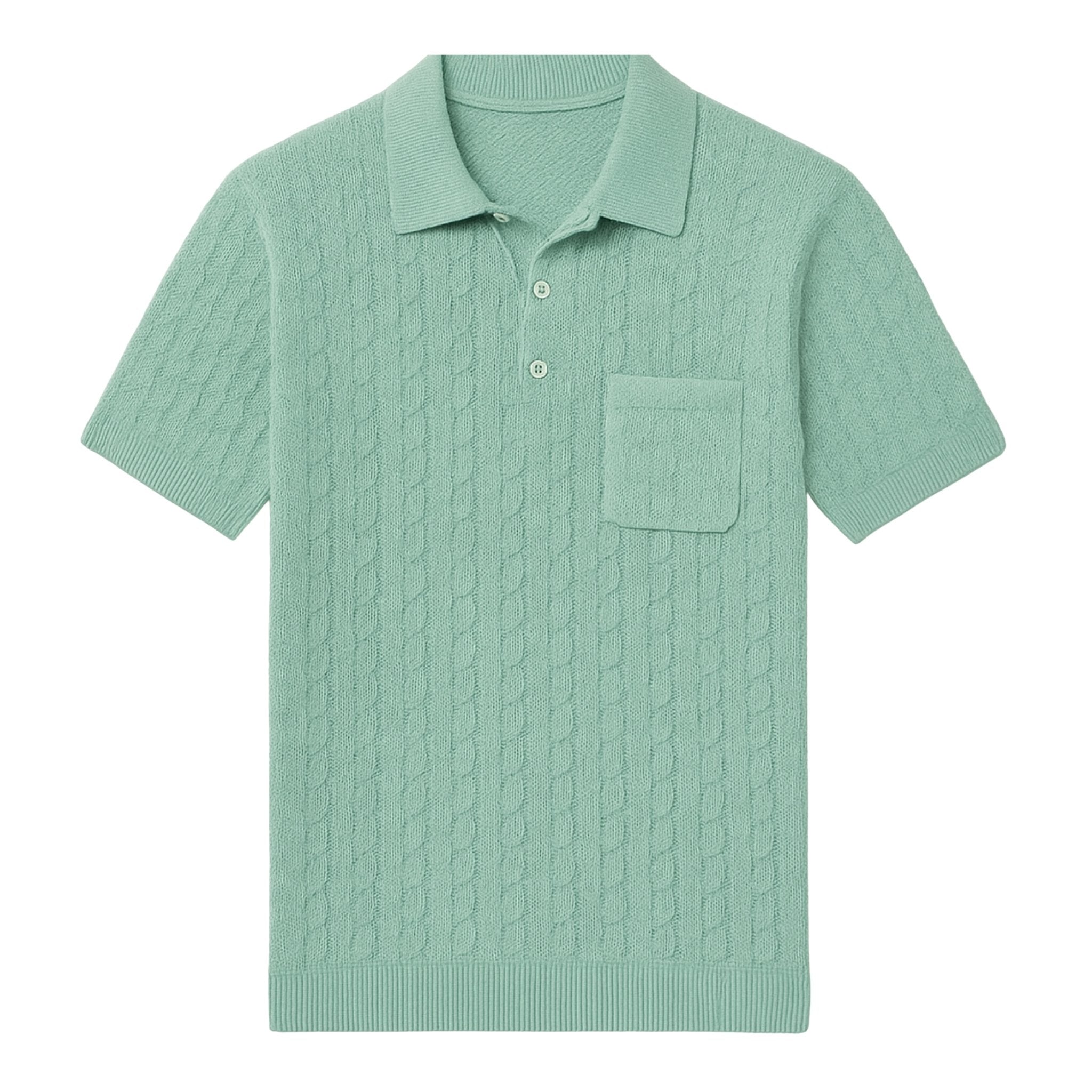 Featuring a timeless cable knit texture, tailored short sleeves, and a structured collar, the silhouette is refined yet relaxed. The serene sky blue hue enhances its versatility, pairing easily with neutrals, denim, or white linen.