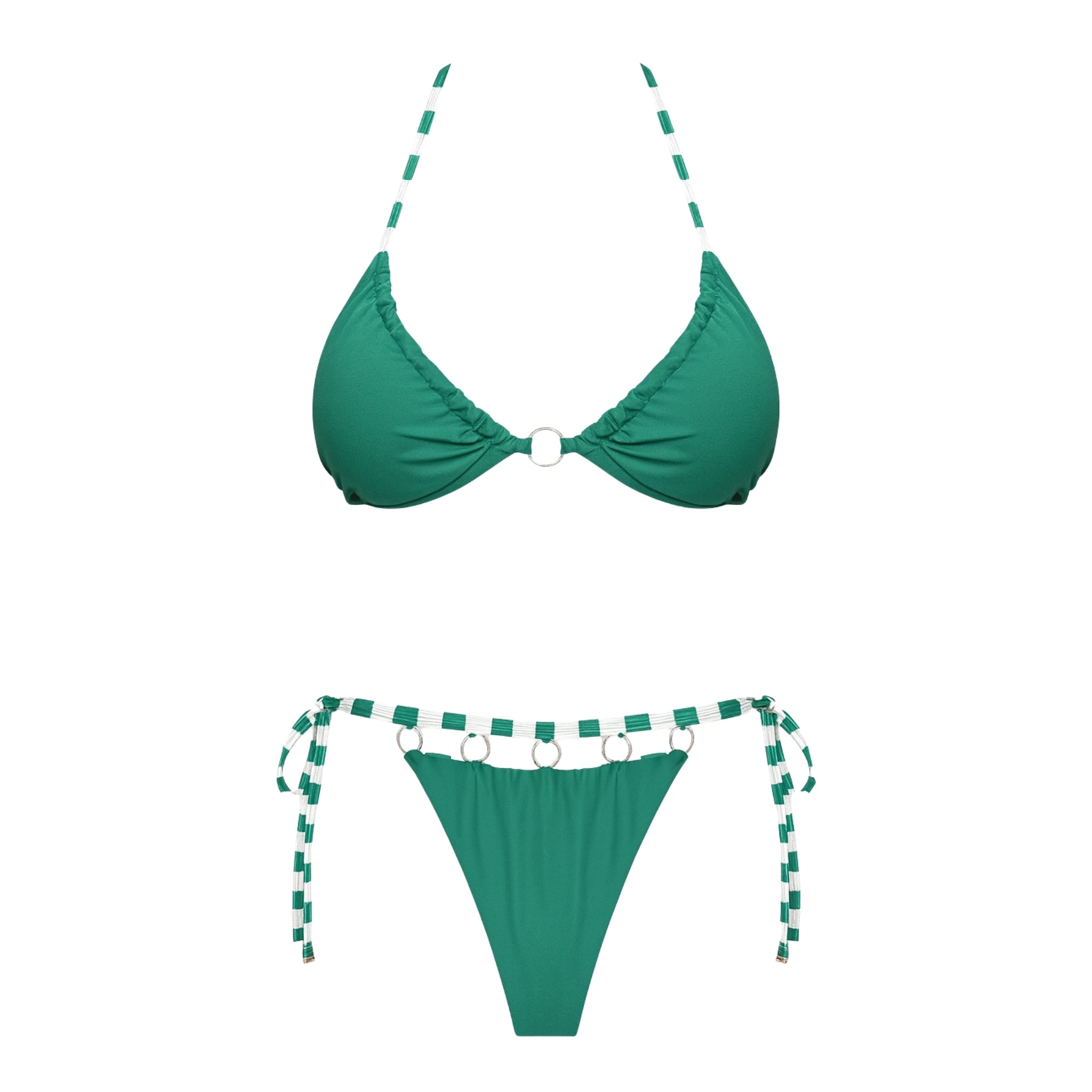 SELL WITH USInfused with playful sophistication, the Turquoise String Bikini Set from LIVE KOLIBRI brings fresh energy to your summer swimwear rotation. The adjustable triangle top is framed by turquoise-and-white striped straps, meeting at a polished metal ring for a subtle statement. Matching bottoms feature cheeky coverage, side ties for a personalized fit, and a row of gleaming metal hoops at the hips for modern edge.