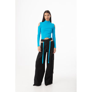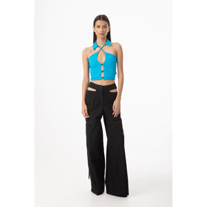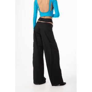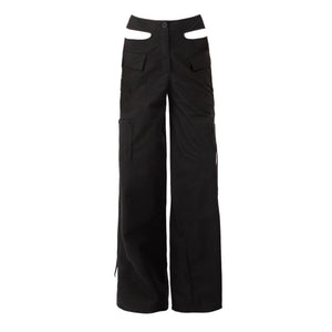 Black cotton straight-leg cargo pants, featuring functional pockets and a cut-out detail between the waist and hips that accentuates the upper silhouette like a built-in belt. Crafted for structure and comfort, these pants blend utilitarian style with a bold, modern twist. Made in Mexico, designed by Tania Orellana. Ideal for statement casual looks or elevated streetwear styling.