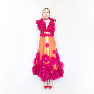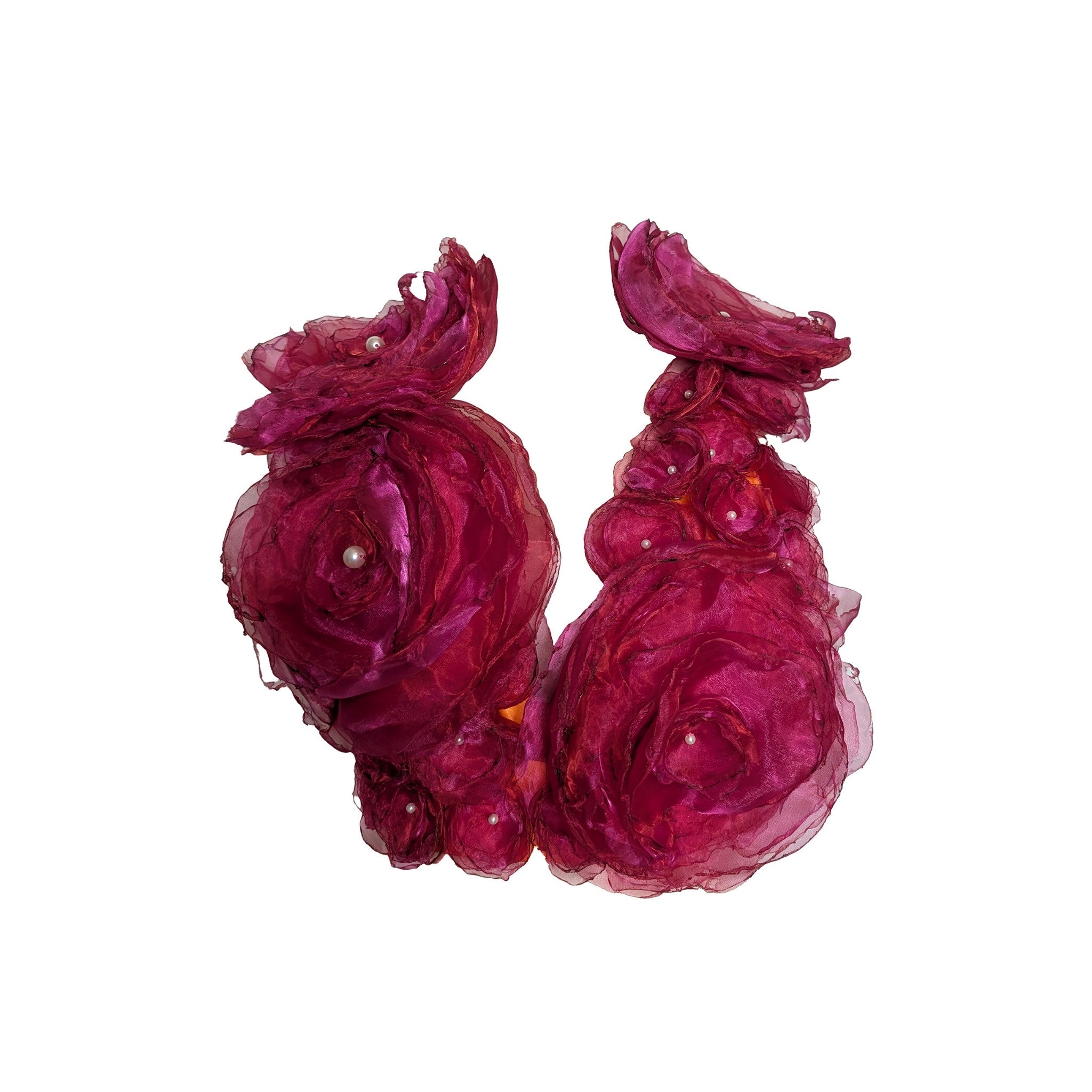 The In-Bloom top is a must-have showstopper. This vibrant silk piece is embellished with handmade pink organza flowers, each with a subtle sheen and delicately burned edge for a raw, textured finish. A romantic lace-up back adds contrast to the soft pearls, giving the top a perfect balance of elegance and edge.