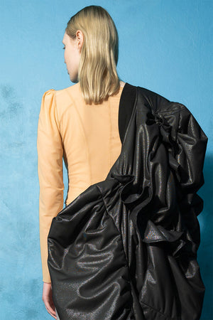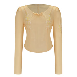 The Beige Mesh Top with Silicone Pattern by MASHAT is a semi-sheer, stretch mesh long-sleeve top in a soft beige tone. Featuring a paneled construction with a scoop neck, padded shoulders, ruched front, and voluminous gigot sleeves, it’s finished with handmade silicone graphics for a bold, tactile effect.