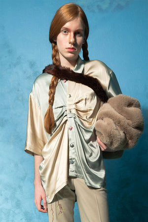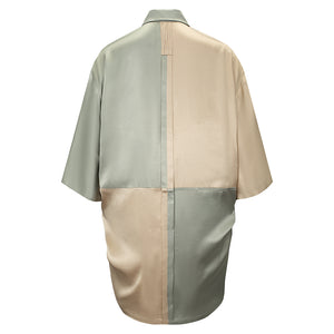 The Butterfly Paneled Shirt by MASHAT is a short-sleeve, oversized shirt with a masculine cut, crafted from soft viscose satin. Available in Golden & Silver and Full Black tones, it features a loose fit with paneled construction, a spread collar, front pleats, and a box pleat at the back.