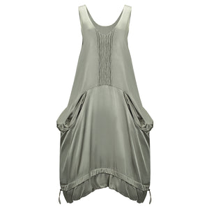The Silver Supernal Transformable Over Dress by MASHAT is a versatile viscose satin midi dress, available in silver, golden, and black tones. Designed with a plunging V-neck and loose fit, it features handmade wrinkled pleats at the front and back for sculptural texture.
