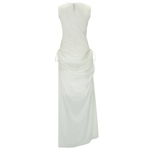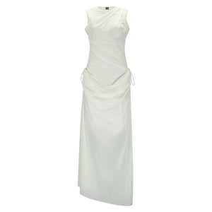 The White Radiancy Body Dress by MASHAT is a shimmering, semi-sheer maxi crafted from lightweight lurex jersey. Designed with elegant draping, ruching, and a layered silhouette, it features hand-painted graphics on the bodysuit for a one-of-a-kind finish. Complete with a raw-edge hem and adjustable closure, this dress is a bold statement in modern femininity—no two pieces are alike.