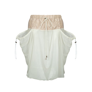 The White Radiancy Dress & Skirt by MASHAT is a versatile, lightweight piece crafted from semi-sheer lurex jersey in a luminous white tone. Designed to be worn as either a dress or a low-rise skirt, it features a draped silhouette with an elasticized drawstring waistband, extended pockets with bungee-style drawstrings, and silver-tone hardware. The standout detail is the organza yoke adorned with MASHAT’s quilted signature lips motif. Fully lined for comfort, this piece merges playful design with multifunctional elegance.