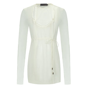 The White Radiancy Paneled Blouse by MASHAT is a lightweight, semi-sheer lurex jersey blouse in a radiant white tone. Designed in a blazer-inspired silhouette, it features layered paneling, a scoop neck with vintage three-button closure, and a self-tie drawstring waist for adjustable shaping. Finished with five-button surgeon’s cuffs and silver-tone hardware, this unlined piece blends modern lightness with nostalgic elegance.