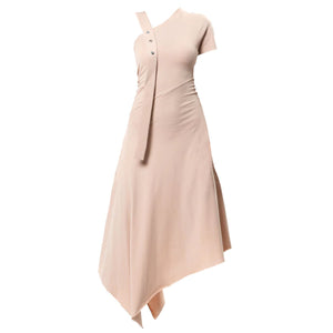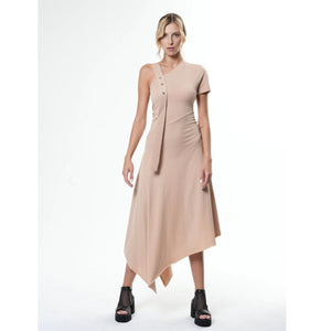 This open back dress has a few accents that will definitely not leave you unnoticed.The studs on the shoulder strap are decorative and make a top accent. The fit is loose and comfortable which makes it a perfect daily outfit. One strape and one short sleeve give a beautiful asymmetry that goes amazing with the hem.