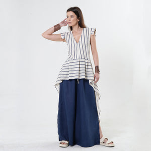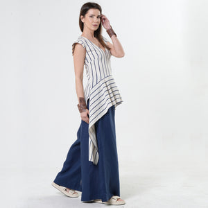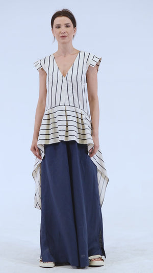 SELL WITH USWith its avant-garde design, this stylish striped asymmetric top is a bold fusion of modern design and effortless elegance. Featuring a deep V-neckline, cap sleeves, and a dynamic high-low hemline with drapes, it creates a striking silhouette. The contrast between vertical and horizontal stripes adds a contemporary touch. This tunic closes with a hidden zipper.
