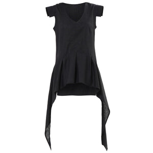 Striking in silhouette yet effortless to wear, METAMORPHOZA’s asymmetric linen top in black is a study in directional minimalism. Crafted from a breathable linen-cotton blend, it features a plunging V-neckline, crisp cap sleeves, and a sculptural high-low hem that creates movement with every step. Front pleats add tailored dimension, while a hidden back zipper keeps the look sleek and uninterrupted.