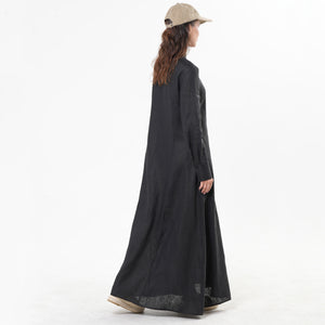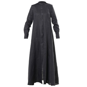 Sleek, structured, and seasonless — METAMORPHOZA’s black long sleeve linen maxi dress is an elegant essential for the modern minimalist. Crafted from a breathable cotton-linen blend, this full-length dress features a tailored high neckline, long sleeves, and a clean A-line silhouette that skims the body without clinging. A full button-down front and discreet side pockets add refined functionality to the design.