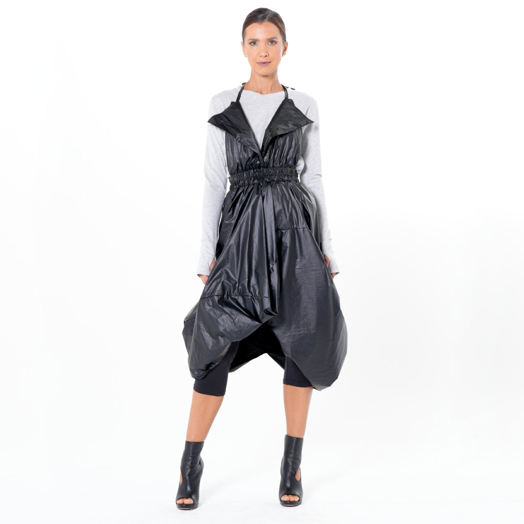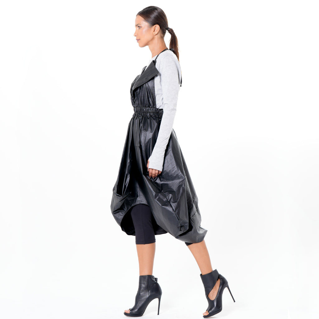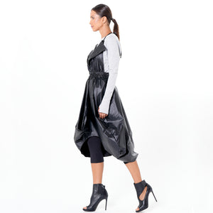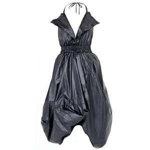 Elevate your layering game with this avant-garde pinafore, crafted from lightweight fabric in a dramatic balloon silhouette with a modern halter neckline. The adjustable back ties and elastic waist create a flattering fit, while side pockets add subtle functionality. Shiny yet structured, it’s available in black and deep green for versatile styling. Designed to layer over tops or wear solo, this piece blends comfort, function, and bold, sculptural style.
