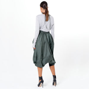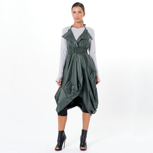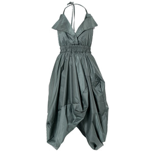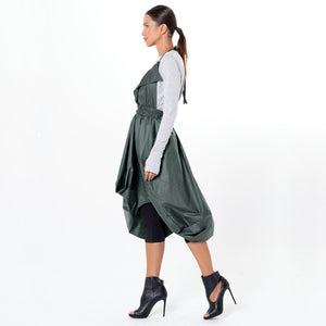 SELL WITH USElevate your layering game with this avant-garde pinafore, crafted from lightweight fabric in a dramatic balloon silhouette with a modern halter neckline. The adjustable back ties and elastic waist create a flattering fit, while side pockets add subtle functionality. Shiny yet structured, it’s available in black and deep green for versatile styling. Designed to layer over tops or wear solo, this piece blends comfort, function, and bold, sculptural style.