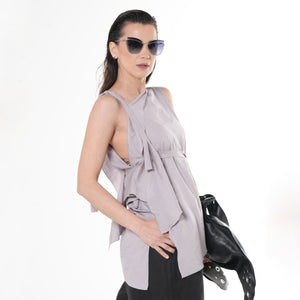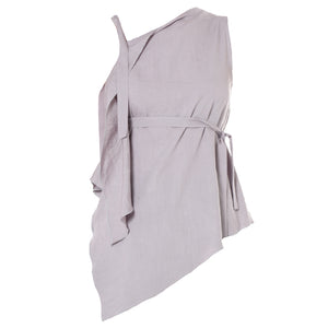 Sculptural softness meets seasonal ease in this sleeveless asymmetric top by METAMORPHOZA. Rendered in a serene lilac hue, the top is crafted from a breezy viscose-linen blend with a naturally crinkled texture. Its abstract, high-low hemline flows around the body, while an adjustable tie cinches the waist to offer shape without structure.