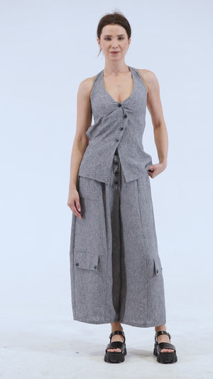 SELL WITH USCrafted from a premium linen blend, this top offers the perfect balance of breathability, durability, and comfort. Featuring a chic halter neckline, a unique asymmetrical button closure, and a flattering, structured fit, this top effortlessly combines sophistication with contemporary design. Another accent is the open-back silhouette, accentuated by a bold T-strap detail with an elasticated band.