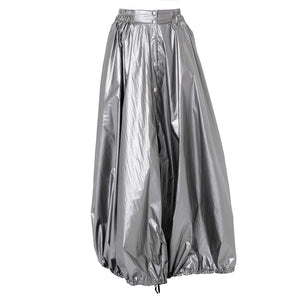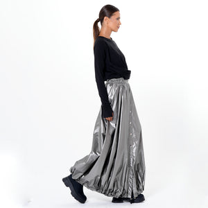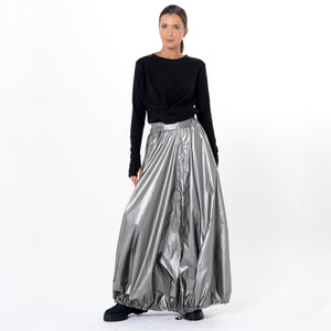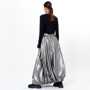 Turn heads with this voluminous long skirt, designed for movement, drama, and versatility. The exaggerated balloon silhouette with an adjustable hemline creates dynamic shape, while the elastic waist and snap closure ensure comfort and security. Crafted from lightweight fabric with a subtle sheen, it flows beautifully with every step. Front buttons and a drawstring hem add practical flair, and the color palette - black or metallic silver - brings modern edge to any look. An avant-garde piece that redefines the maxi skirt with effortless drama.