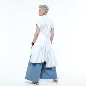 SELL WITH USA fresh take on the classic white shirt, METAMORPHOZA’s pleated tunic shirt merges structure with movement in a piece that feels both refined and radical. Crafted from crisp 100% cotton, it features a traditional short-sleeve, button-down top contrasted by an asymmetrically pleated lower half. The sculptural skirt-like detail adds volume and fluidity, while the fitted bust ensures a flattering, feminine shape.