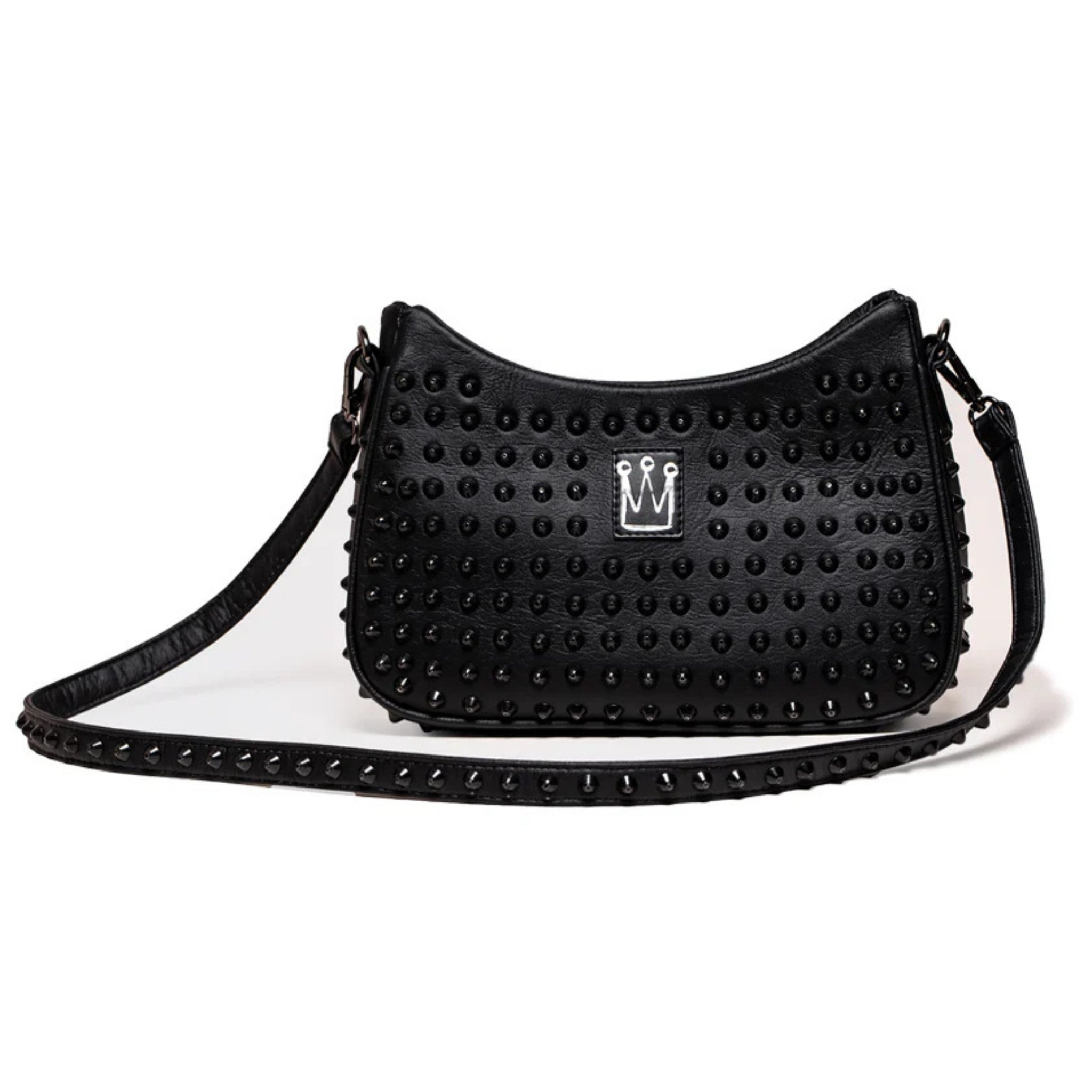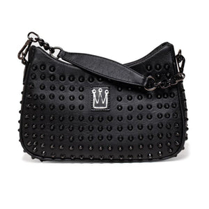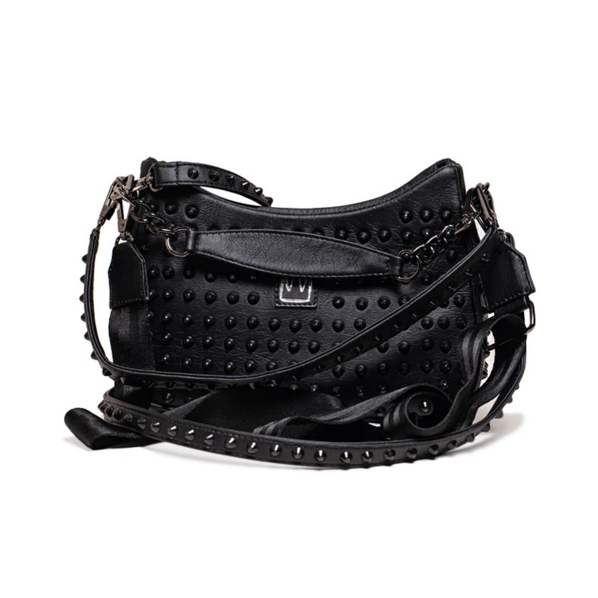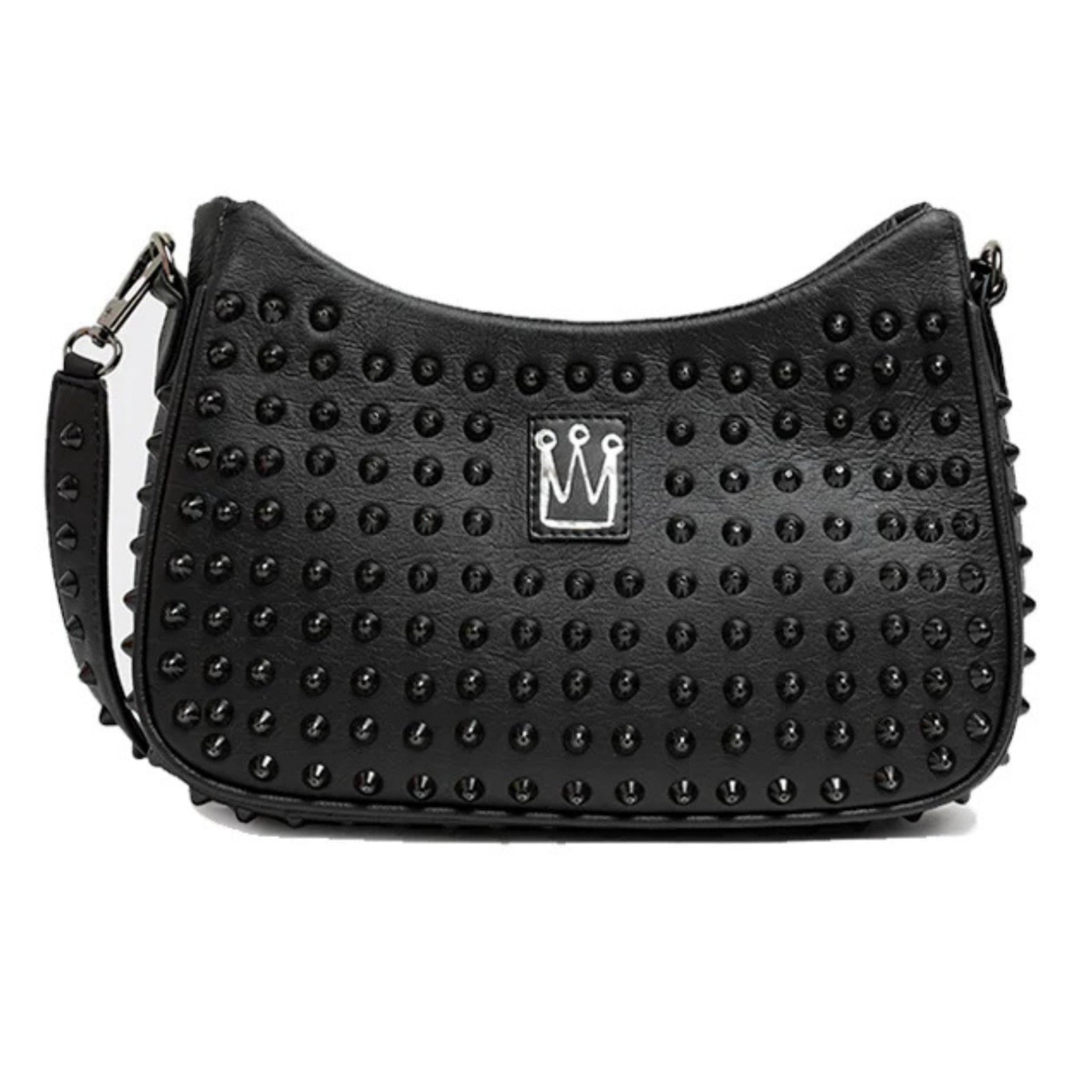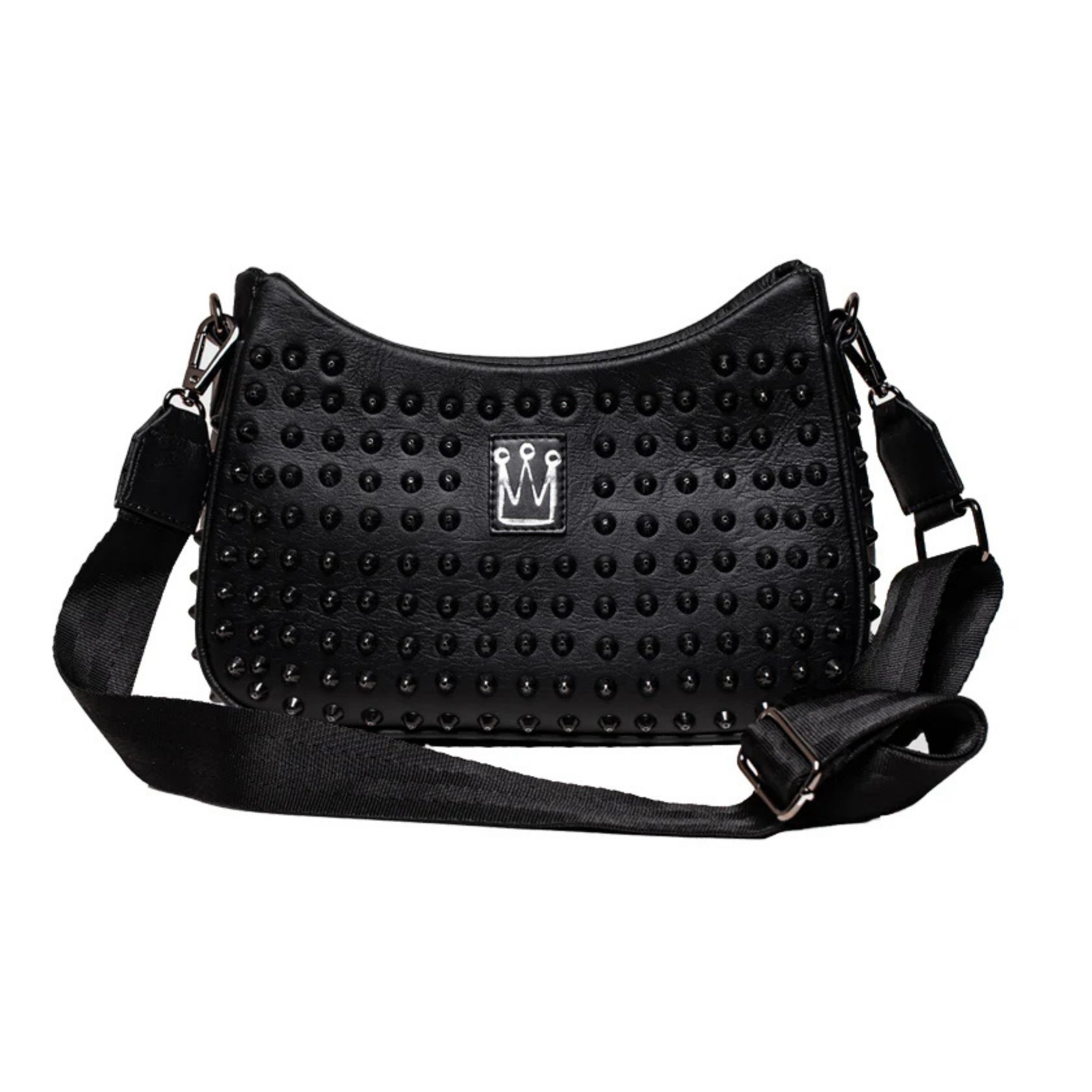 SELL WITH USUnapologetically edgy, the Glam Black Bag redefines statement accessorizing with its rockstar appeal and sculptural attitude. Made from luxe vegan leather, this black shoulder bag features a curved silhouette studded all over with tonal hardware, creating a bold texture and shine. The signature GLAM crown logo adds a final touch of attitude. With three interchangeable straps — a wide sport-style, a classic short shoulder strap, and a mini handle for hand-carrying — this piece adapts effortlessly to your day-to-night lifestyle. Whether paired with leather pants or a slip dress, it’s a rebellious essential for the style-setter who leads, not follows.