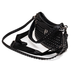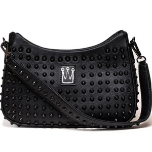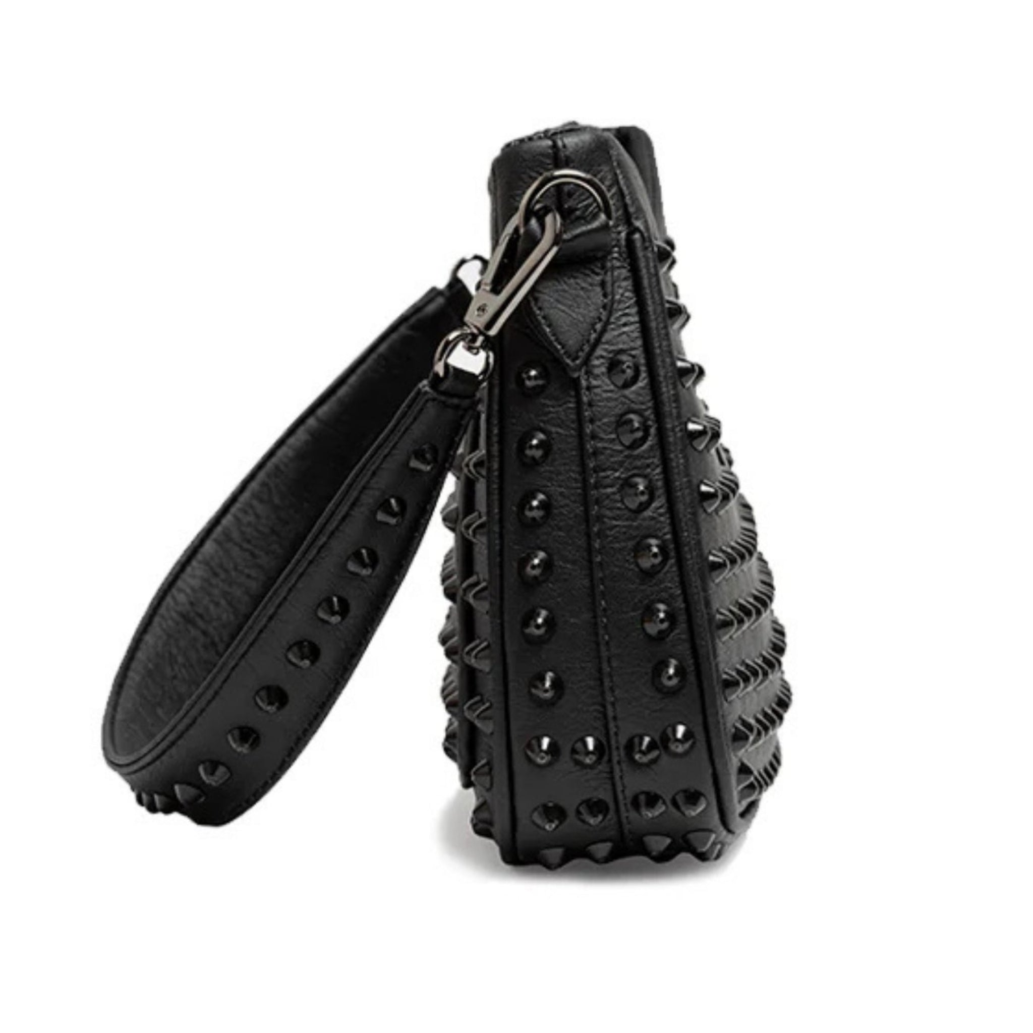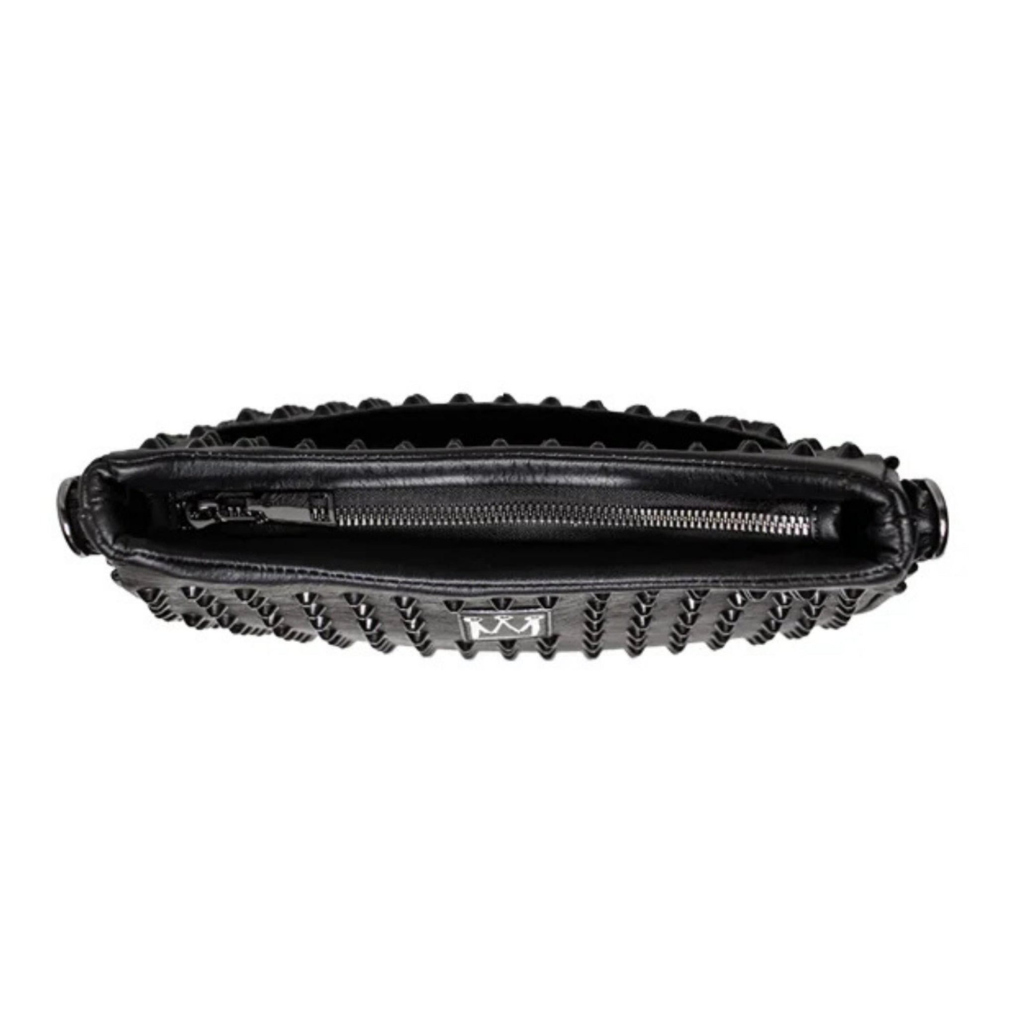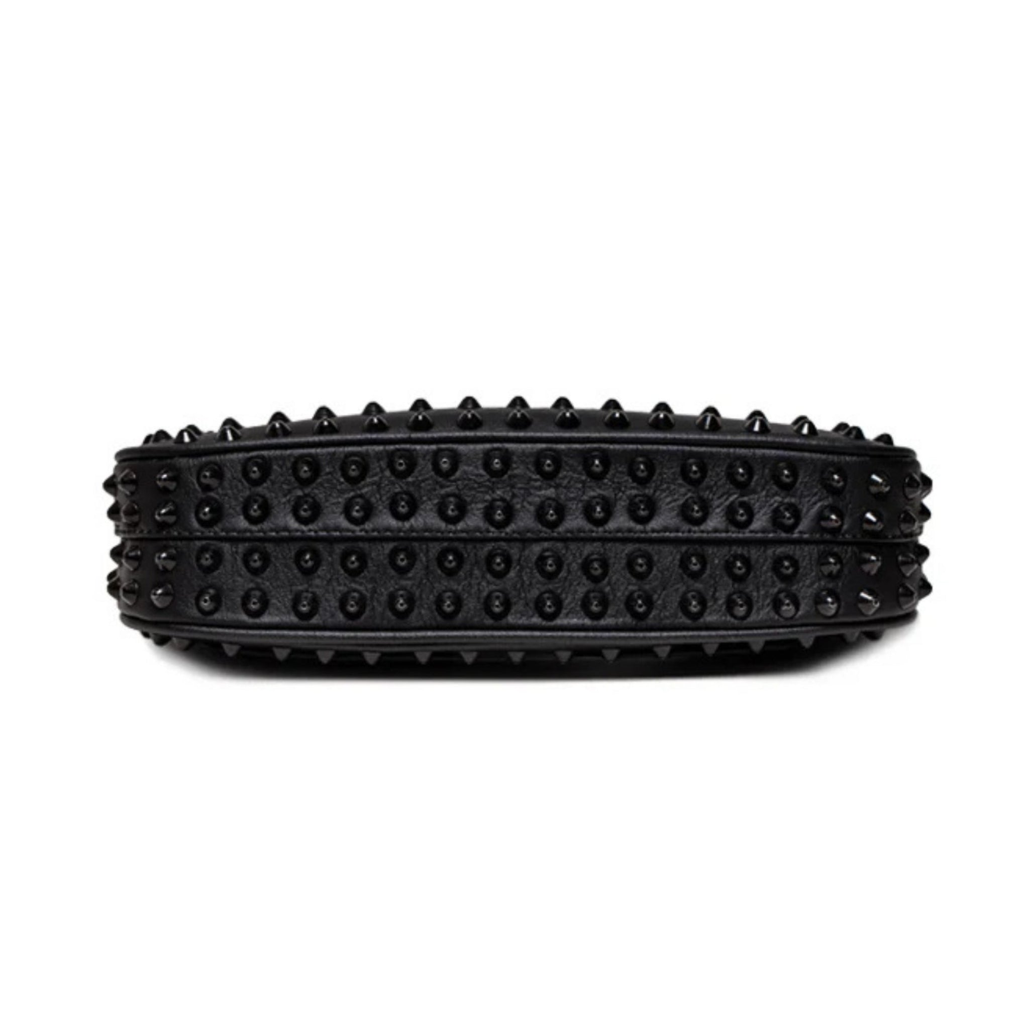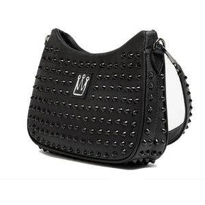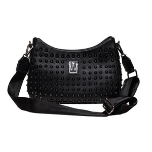 SELL WITH USUnapologetically edgy, the Glam Black Bag redefines statement accessorizing with its rockstar appeal and sculptural attitude. Made from luxe vegan leather, this black shoulder bag features a curved silhouette studded all over with tonal hardware, creating a bold texture and shine. The signature GLAM crown logo adds a final touch of attitude. With three interchangeable straps — a wide sport-style, a classic short shoulder strap, and a mini handle for hand-carrying — this piece adapts effortlessly to your day-to-night lifestyle. Whether paired with leather pants or a slip dress, it’s a rebellious essential for the style-setter who leads, not follows.
