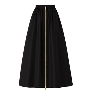 The elasticated waistband ensures all-day comfort, while the bold gold zipper running down the center front injects a confident edge. Designed in a versatile midi length, this piece moves easily between office hours and after-dark moments — just switch up your top and footwear.