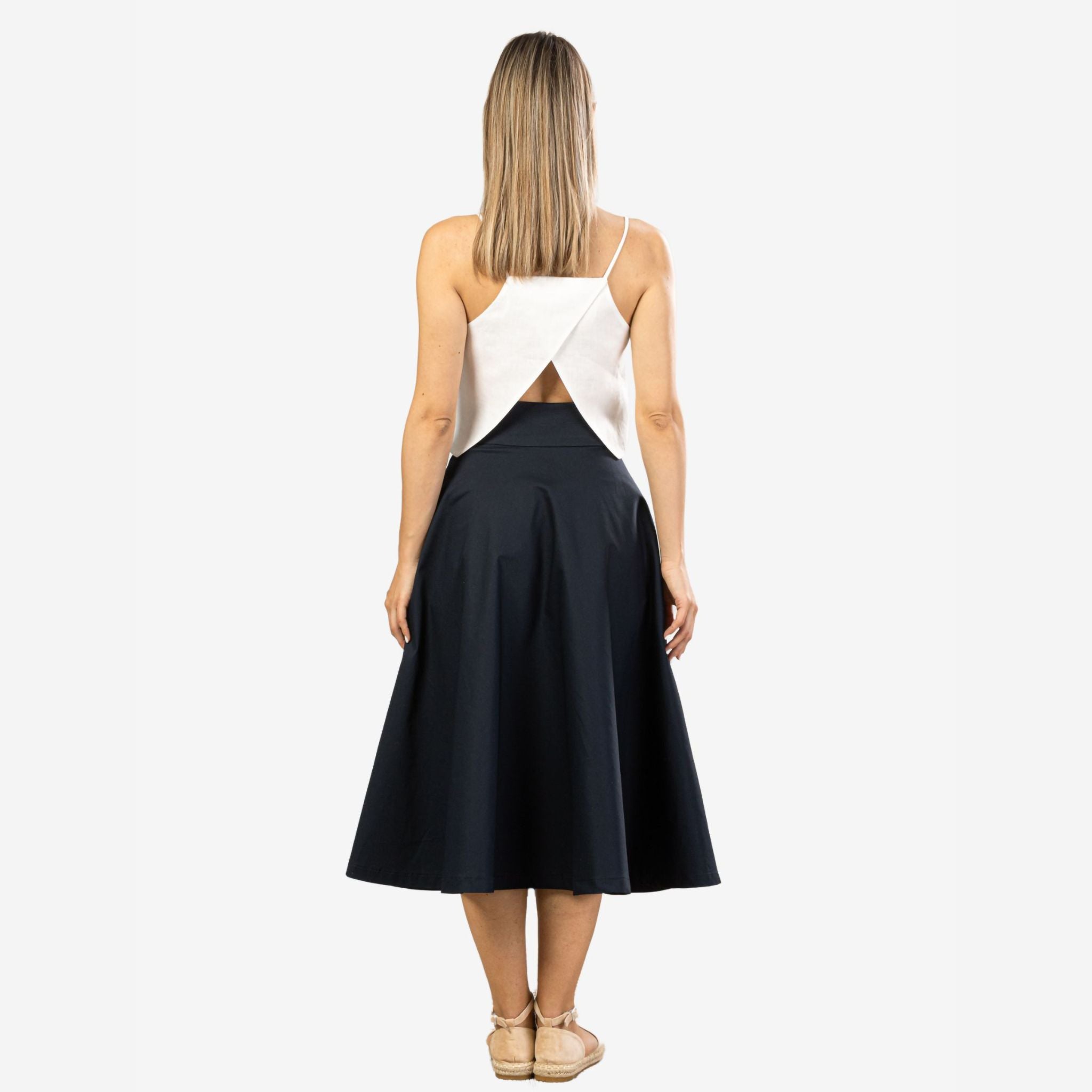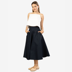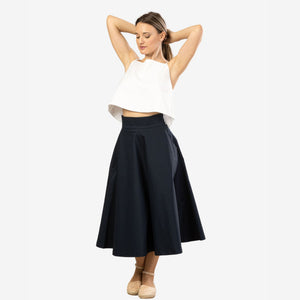 Behold the dark blue midi flared circle skirt - a delightful blend of easy-to-wear style and minimalist elegance. With its flattering mid-calf length and comfortable cotton material, this skirt is your ultimate companion for sweltering summer days. Featuring a waistband with convenient pockets, it seamlessly combines functionality with fashion. Experience the simplicity and versatility of this skirt as you effortlessly elevate your fashion game throughout the season.