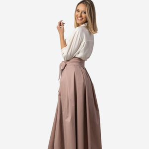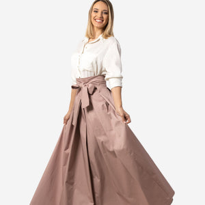 Elevate your wardrobe with our dusty rose high-waisted pleated maxi skirt. This classic and elegant skirt, crafted from a cotton-elastane blend, moves beautifully with every step. The high waist and pleated design create a flattering, feminine silhouette, while the maxi length adds a touch of sophistication. Perfect for any occasion, whether a formal event or a casual day out. Add a touch of elegance to your wardrobe with our high-waisted pleated maxi skirt.