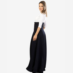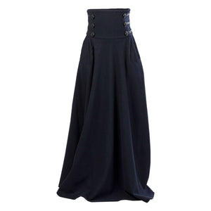 Expand your winter wardrobe with our dark blue high-waisted maxi skirt in wool. Crafted from high-quality, cool wool, it exudes a sophisticated touch. This style features an extremely high waist with stylish buttons, practical pockets for added functionality, and a maxi length that effortlessly combines comfort and elegance, making it a versatile addition to any modern wardrobe.