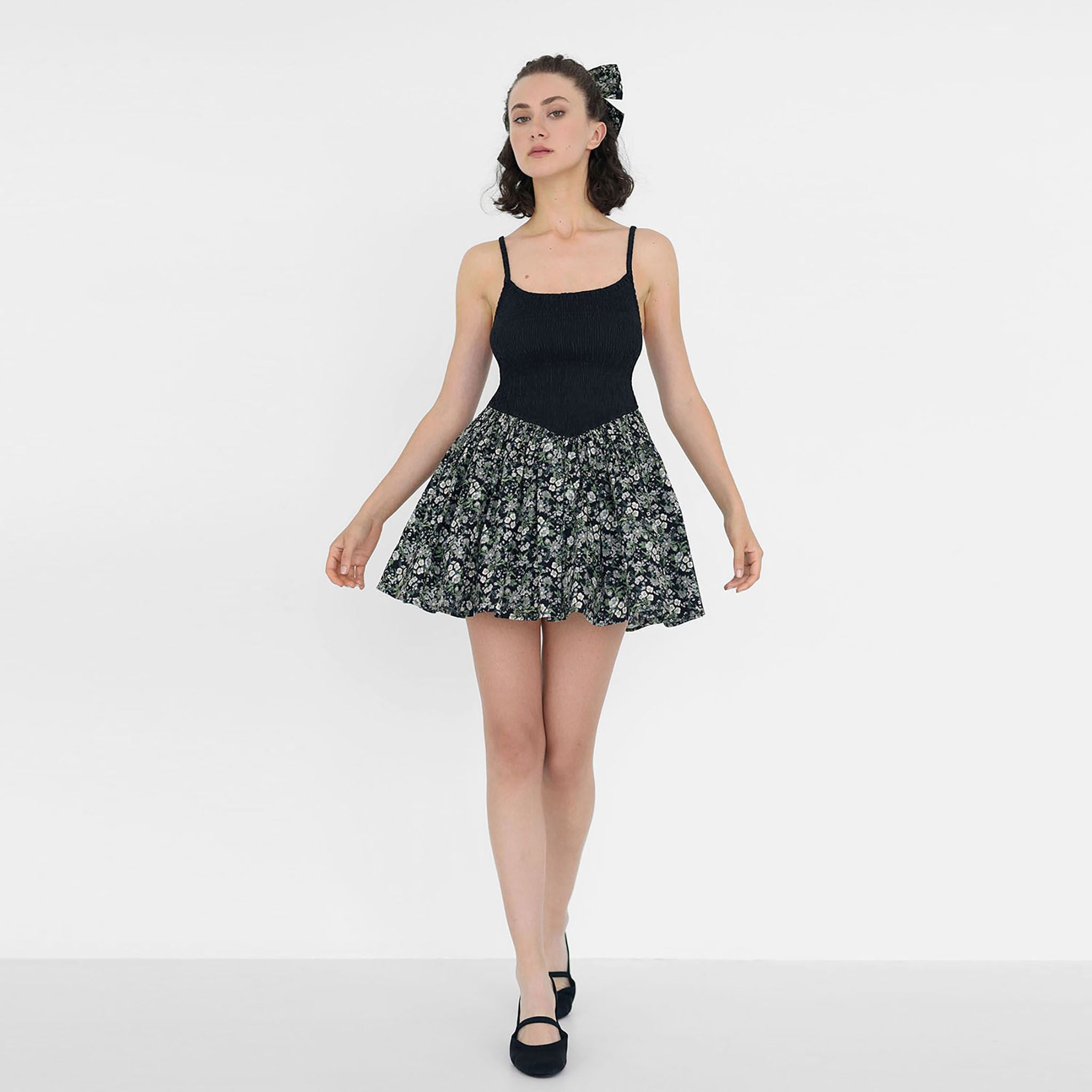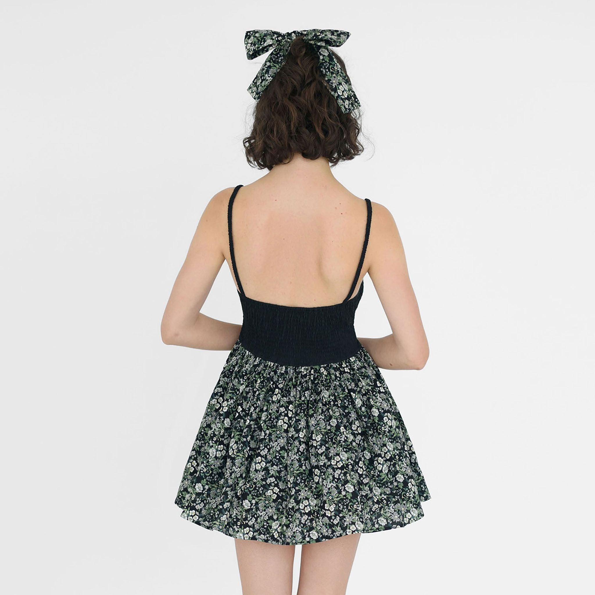 The Bianca Smocked Ballerina Mini Dress is cut in mid-weight cotton. It features a shirred body designed with a Basque waistline and a voluminous skirt, creating a slenderizing effect. The straps are elasticated. A hair ribbon is included.