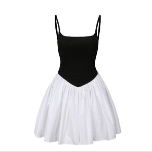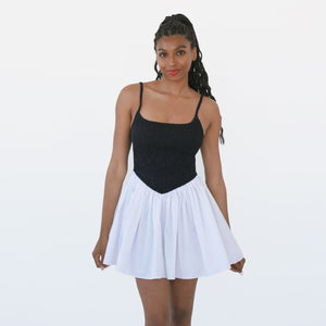 The Bianca Smocked Ballerina Mini Dress is cut in mid-weight cotton. It features a shirred body designed with a Basque waistline and a voluminous skirt, creating a slenderizing effect. The straps are elasticated. A hair ribbon is included.